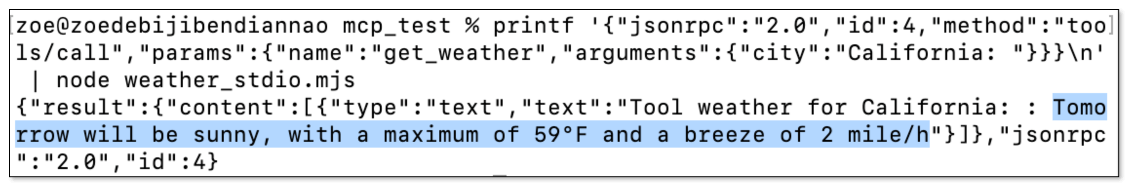 printf '{"jsonrpc":"2.0","id":4,"method":"tools/call","params":{"name":"get_weather","arguments":{"city":"California"}}}\n' | node weather_mcp.mjs