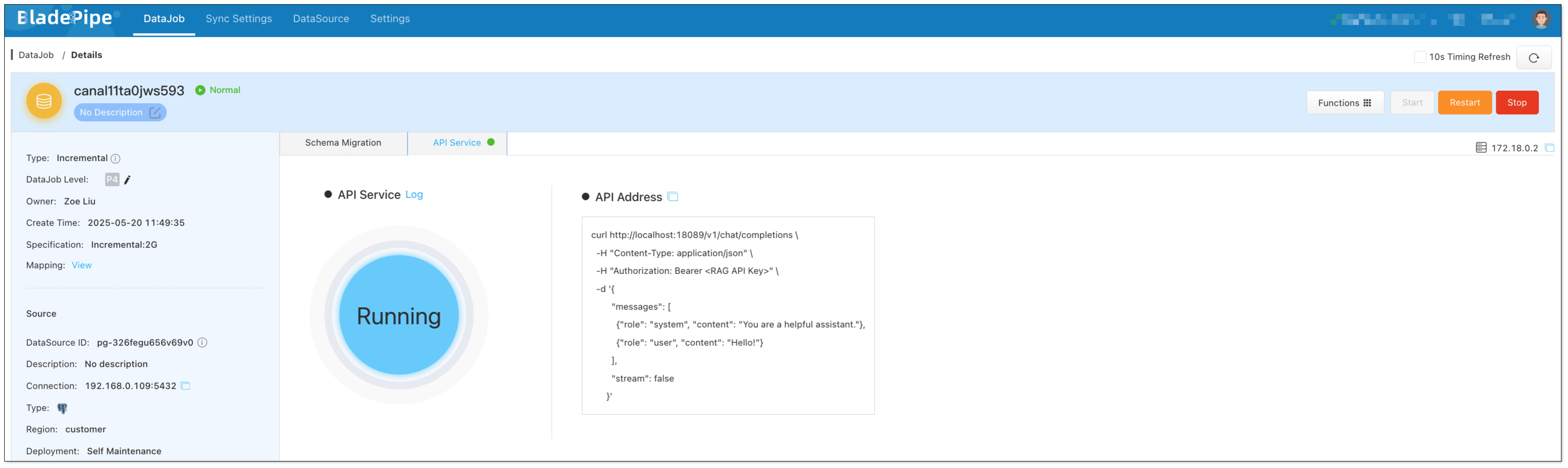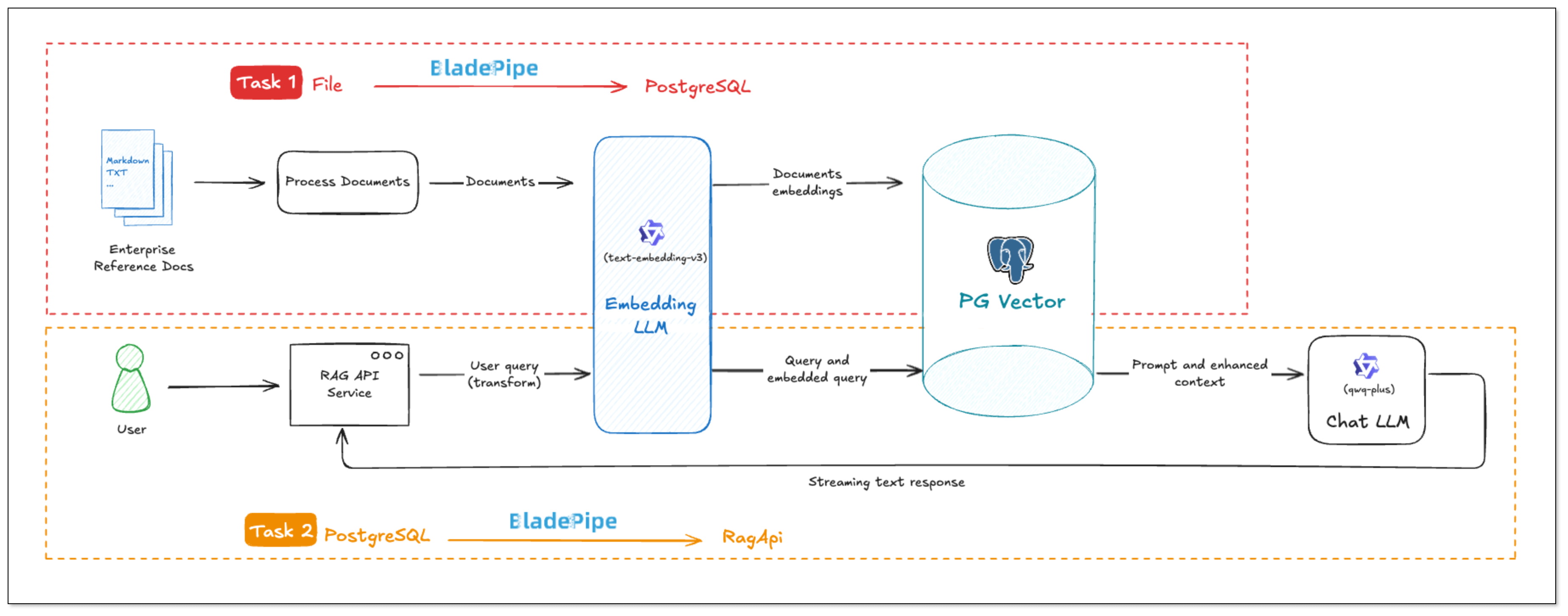 The API of BladePipe RagApi service exposed to the outside world is in OpenAI API format. RagApi turns your enterprise data into a smart assistant in two main steps: