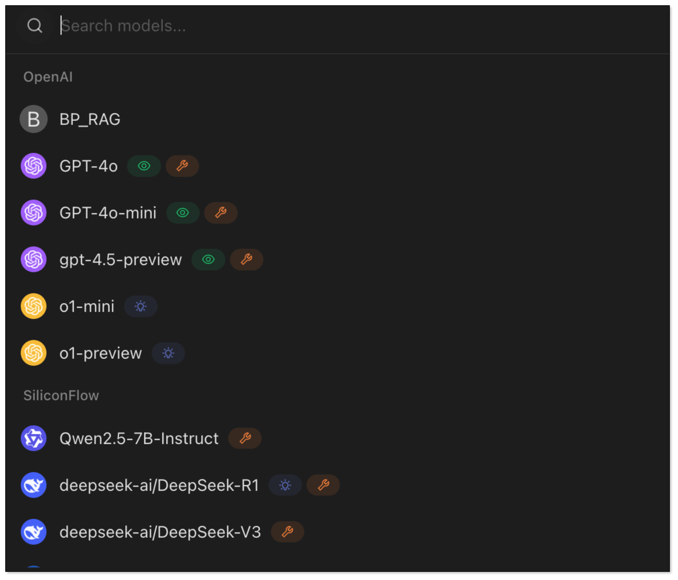 The created Prompt is fed into the configured Chat model (such as qwq-plus, gpt-4o, etc.) to generate the final answer. The interface is an OpenAI format interface, which can be directly connected to the applications. - Call Tools with MCP (Optional)