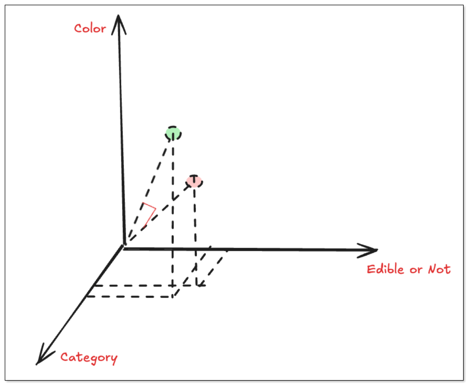 When measuring the semantic similarity, we don't check whether the number value is big or small. Instead, we use something called cosine similarity to check how close their “directions” are. The smaller the angle between two vectors is, the more similar their meanings are.