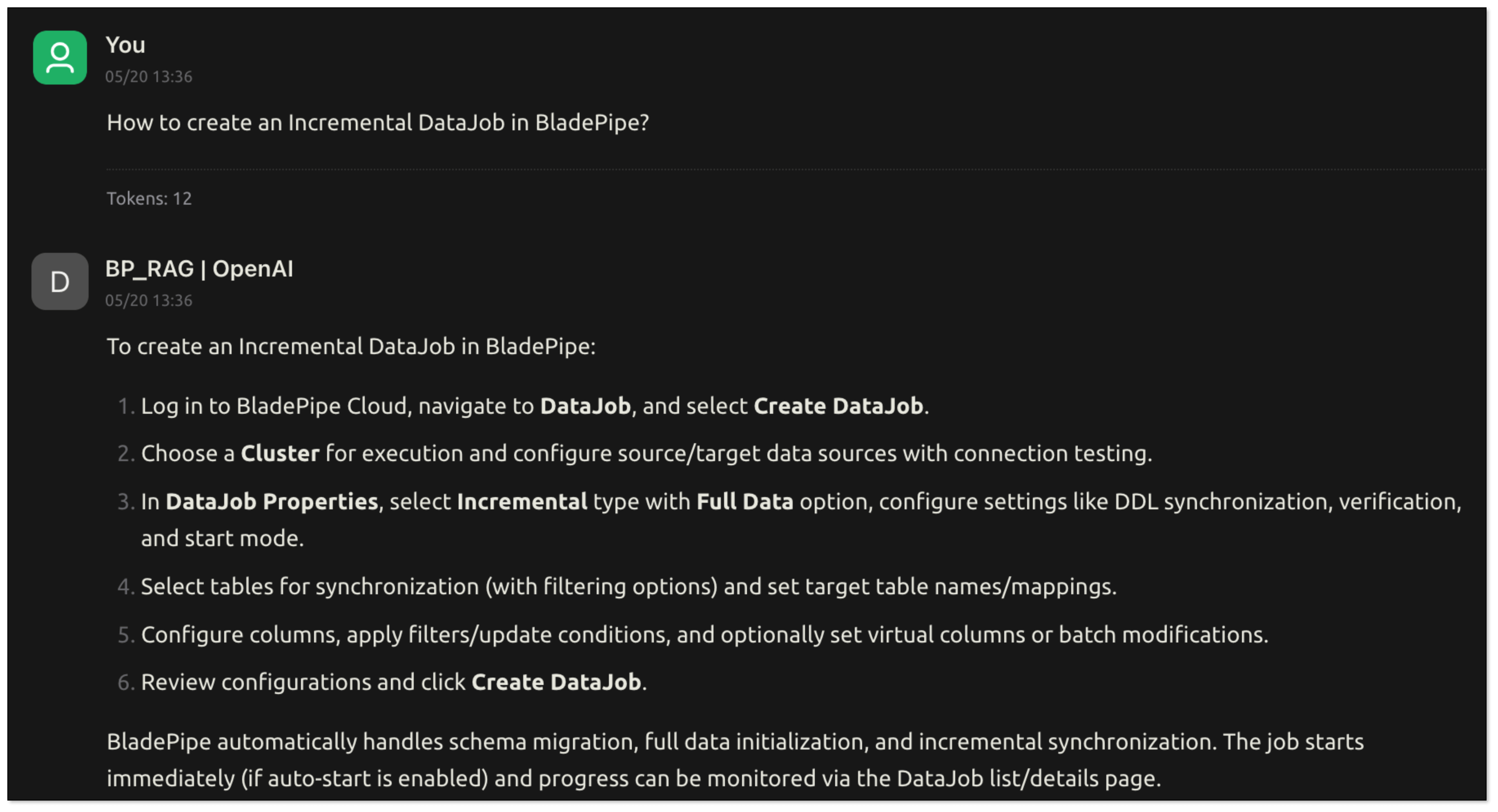 How to create an Incremental DataJob in BladePipe?RagApi will generate the answer based on the vector search and the LLM.