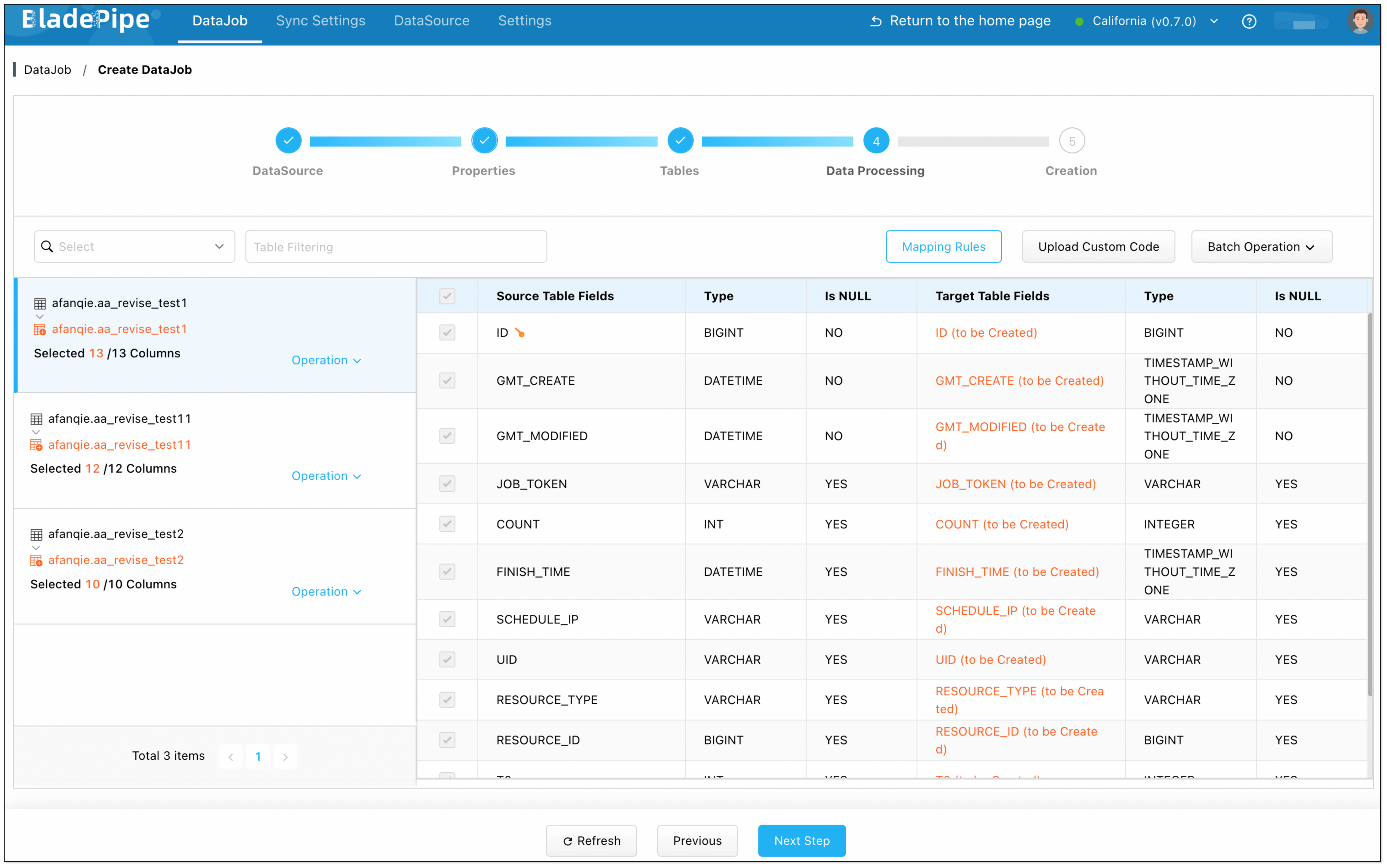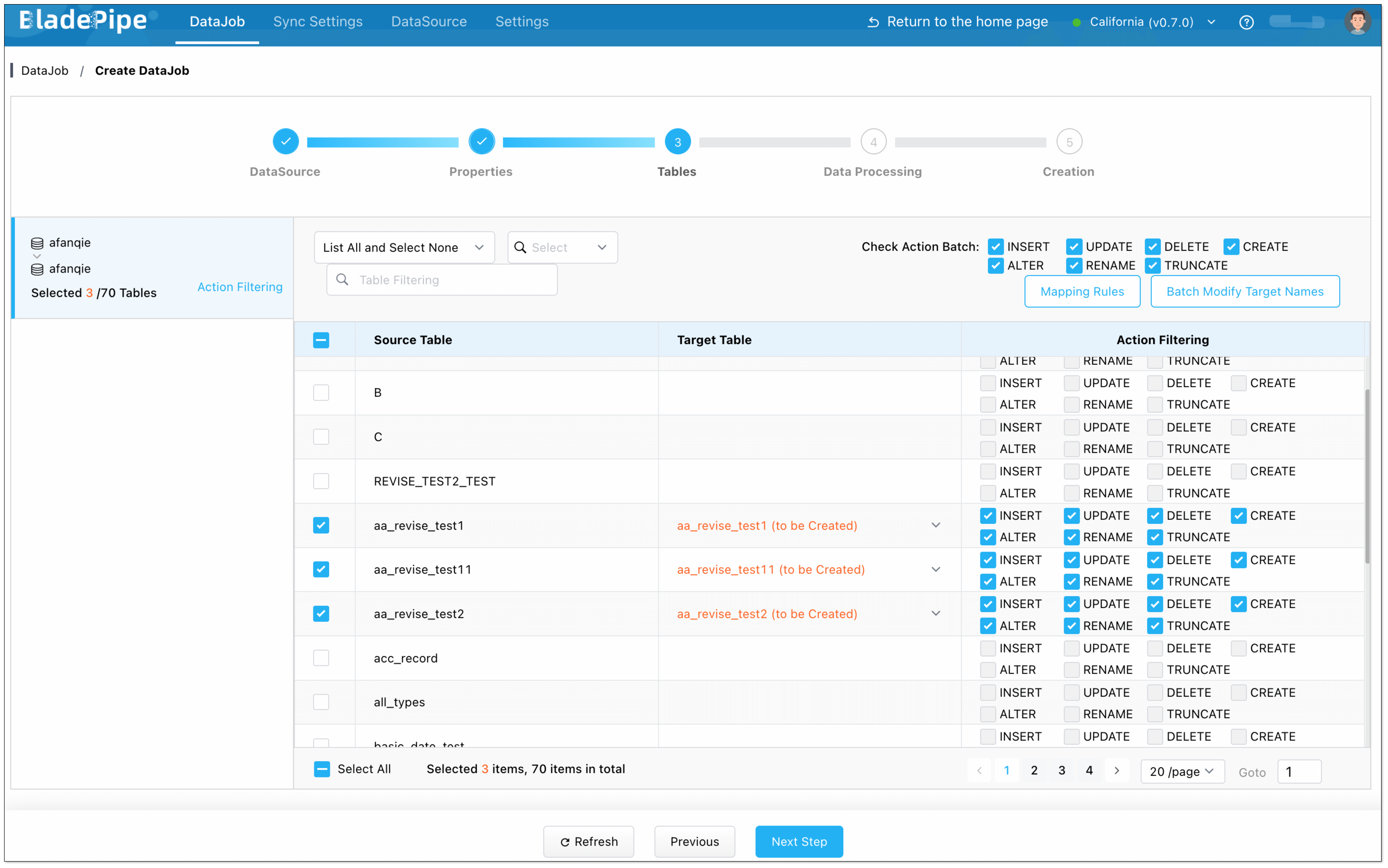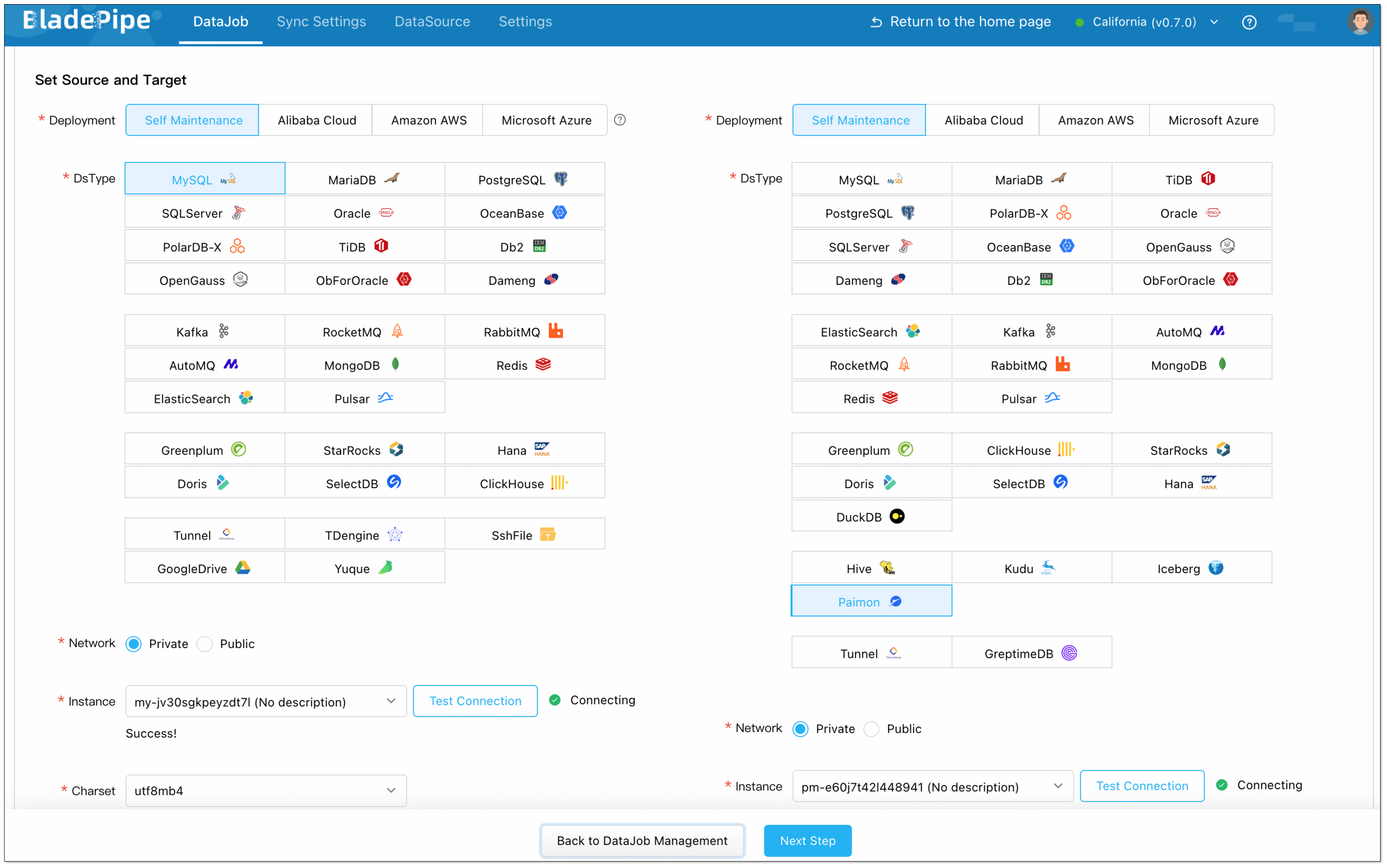 - Select the source and target DataSources, and click Test Connection to ensure the connection to the source and target DataSources are both successful.