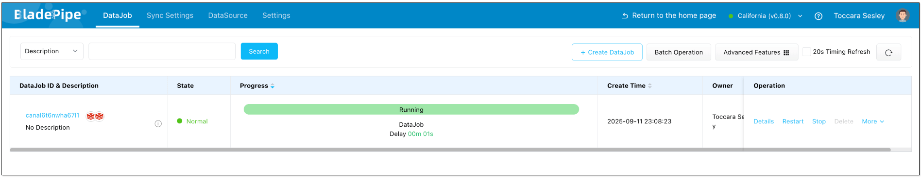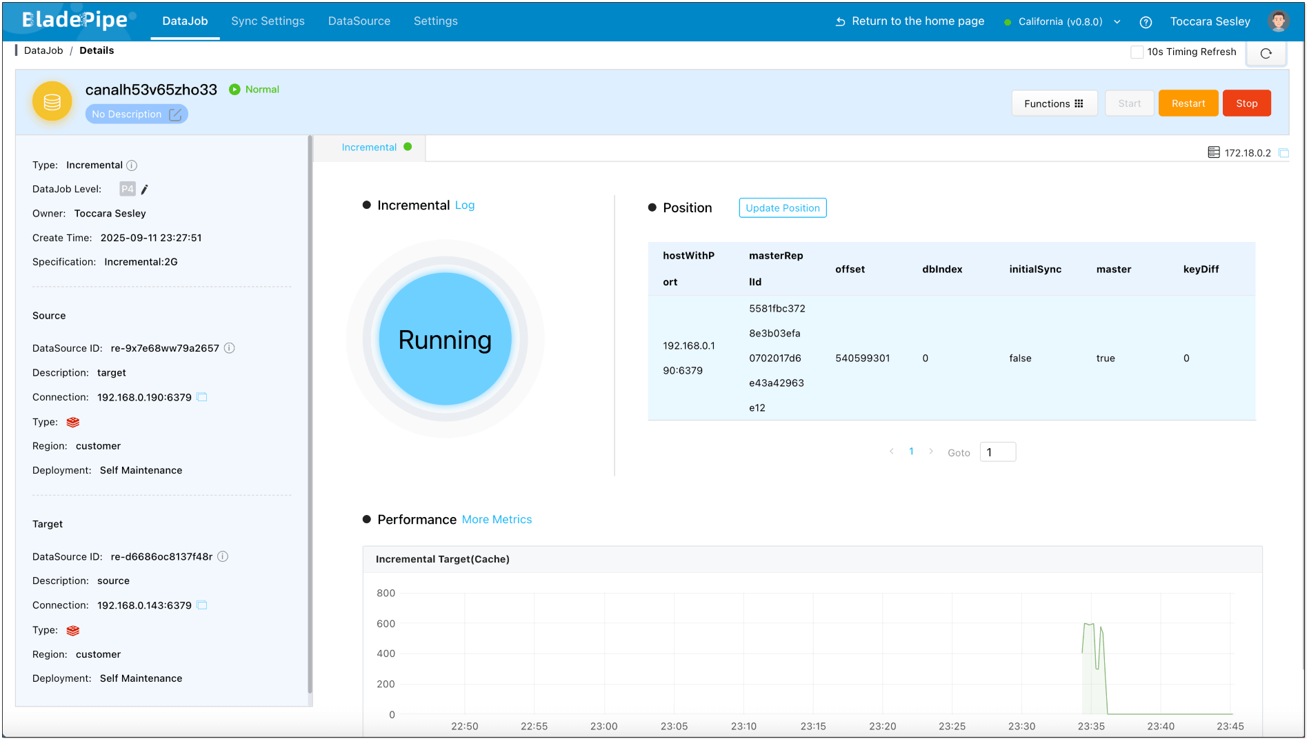 - Start the DataJob. Forward and reverse DataJobs are running with sub-second latency.