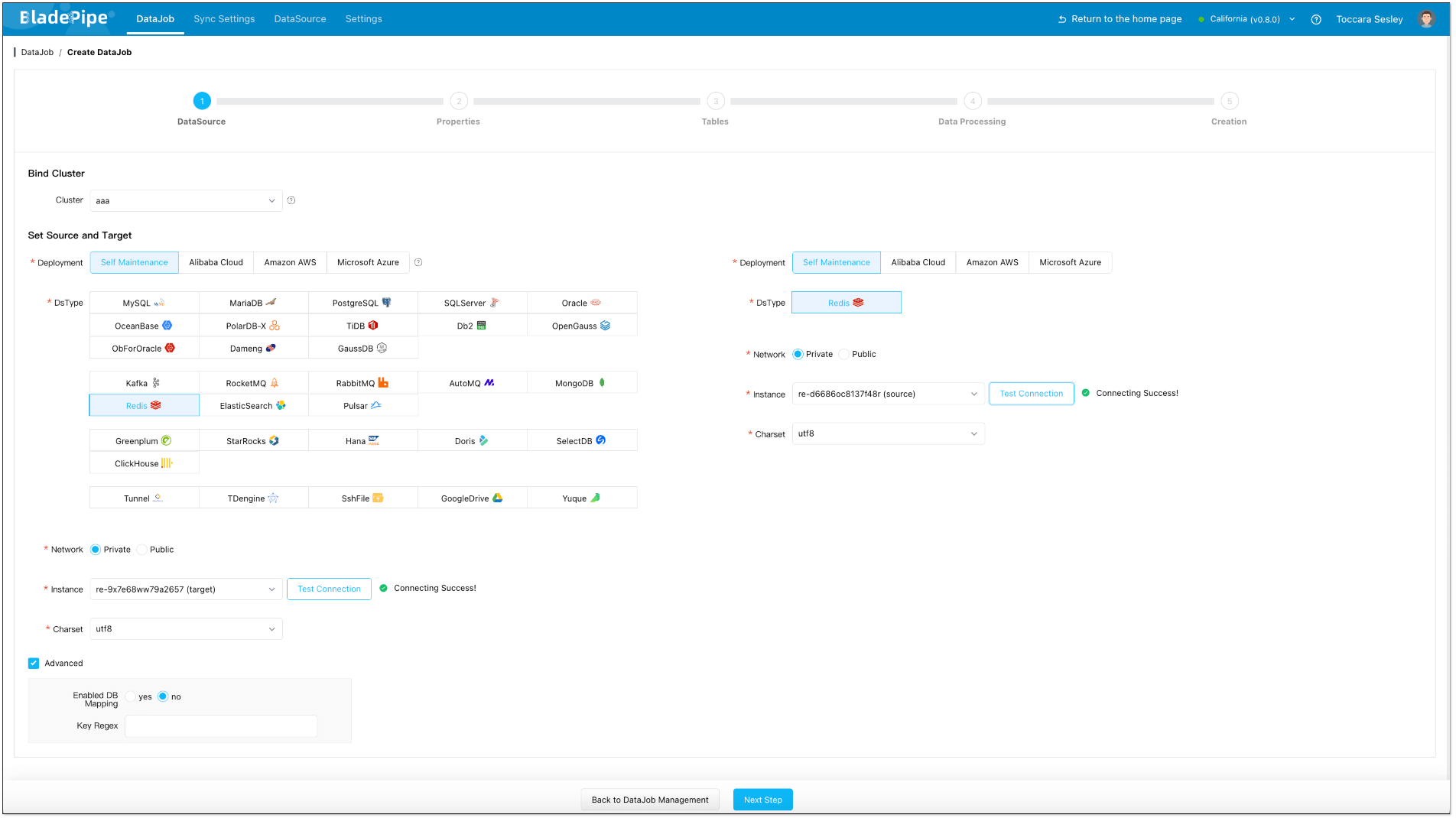 - Select the source and target DataSources, and click Test Connection to ensure the connection to the source and target DataSources are both successful.