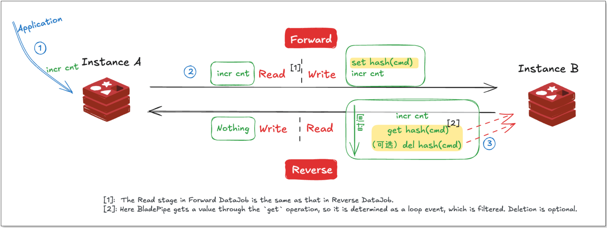Based on the approach used in traditional database bidirectional sync, a straightforward loop-prevention method in Redis is to use auxiliary commands for loop detection. When a normal command is received, its hash value is calculated, and an auxiliary command key is generated. By checking whether the corresponding auxiliary key exists in the opposite direction, BladePipe can determine if a loop has occurred; if it exists, the event is filtered.