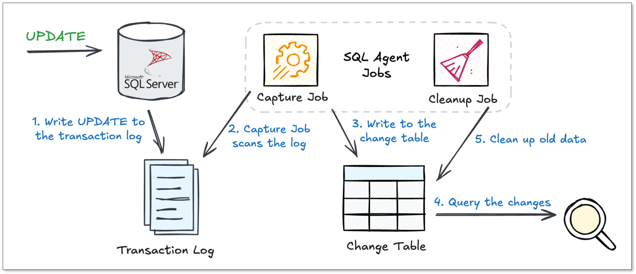 To fully understand the actual CDC process in SQL Server, let’s walk through what happens when an UPDATE occurs on a CDC-enabled table.