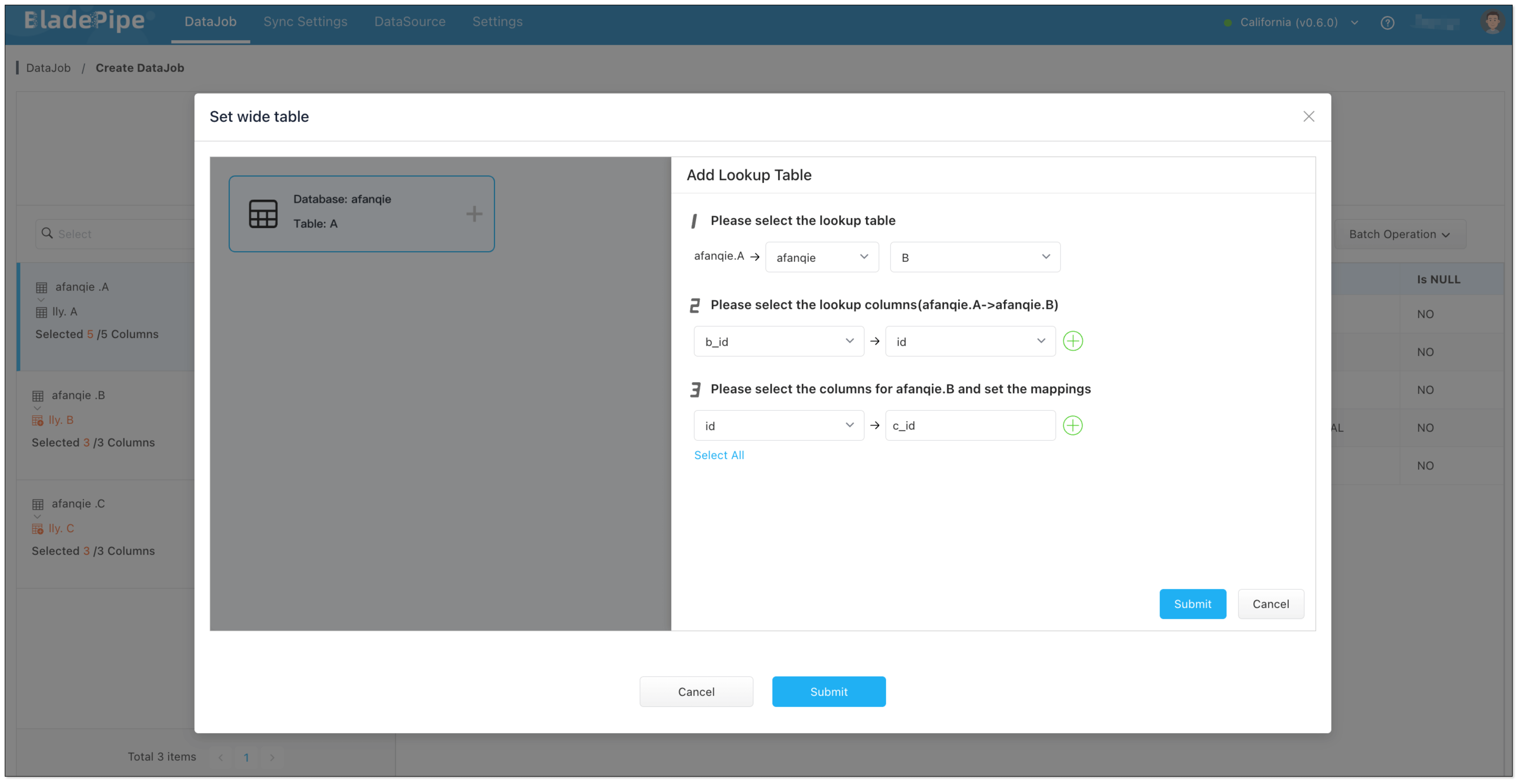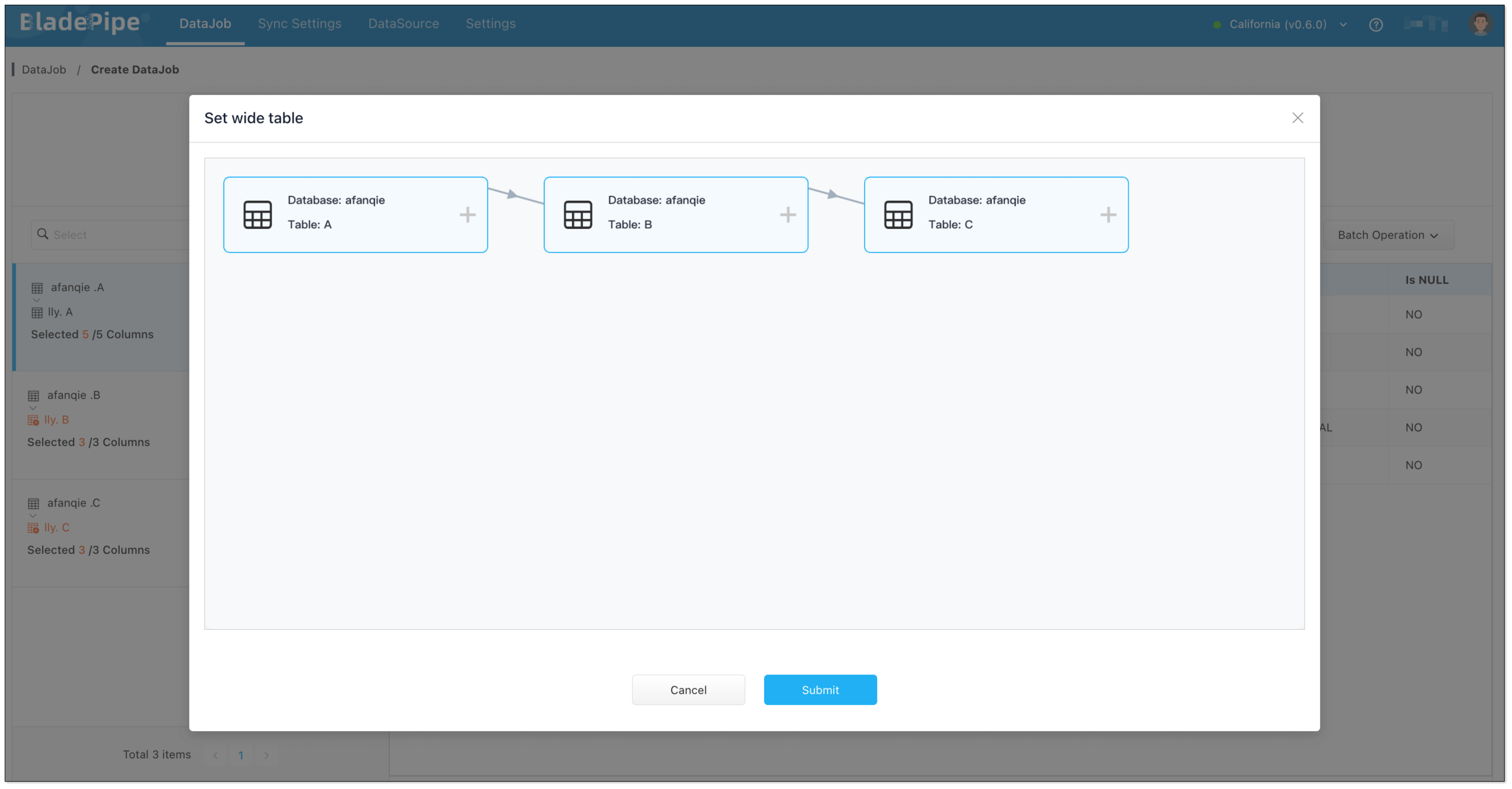 Now, BladePipe supports visual wide table building, enabling zero-code configuration. Users can select a driving table and the lookup tables directly in the UI to define JOINs. The system handles both initial data migration and real-time updates.