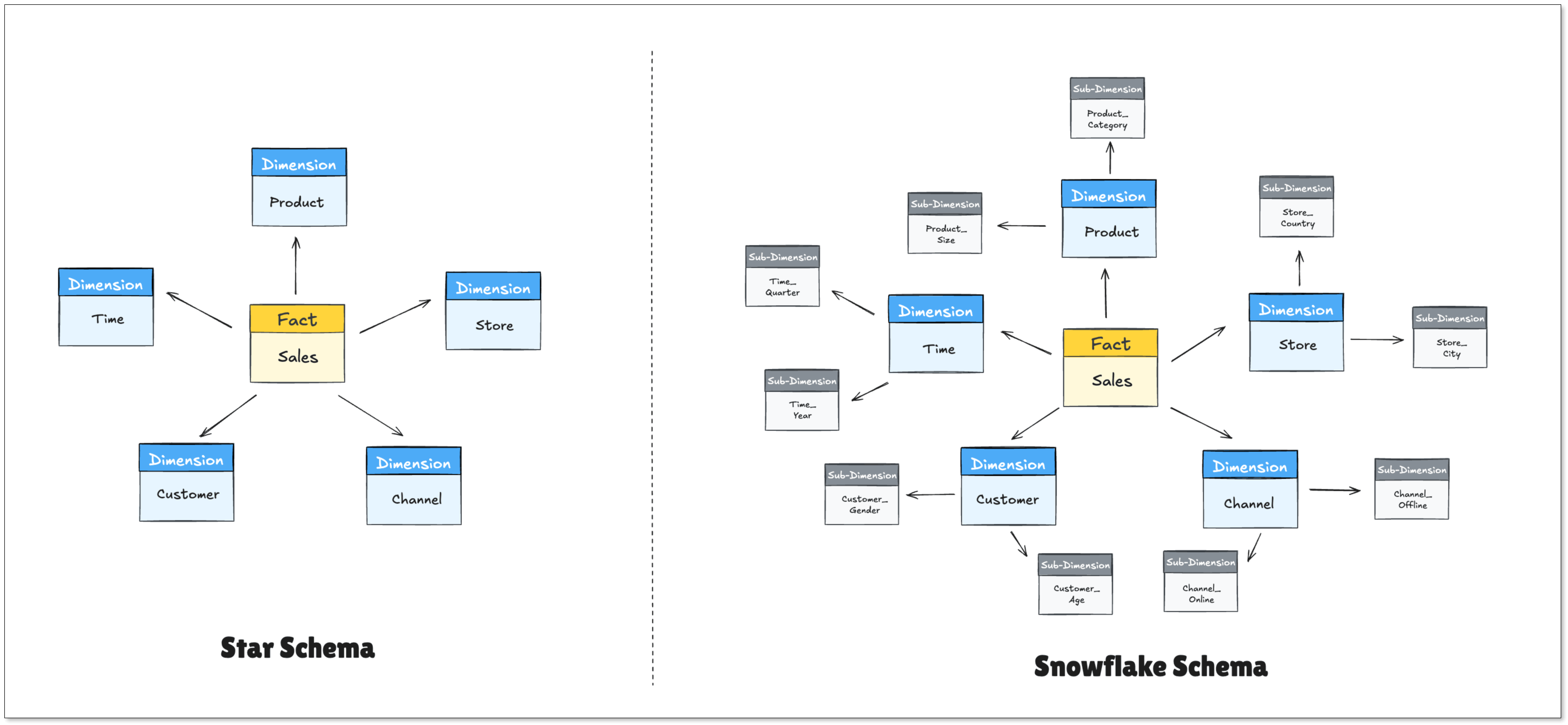 - Star Schema: A central "Fact" table (the numbers) surrounded by "Dimension" tables (the context).