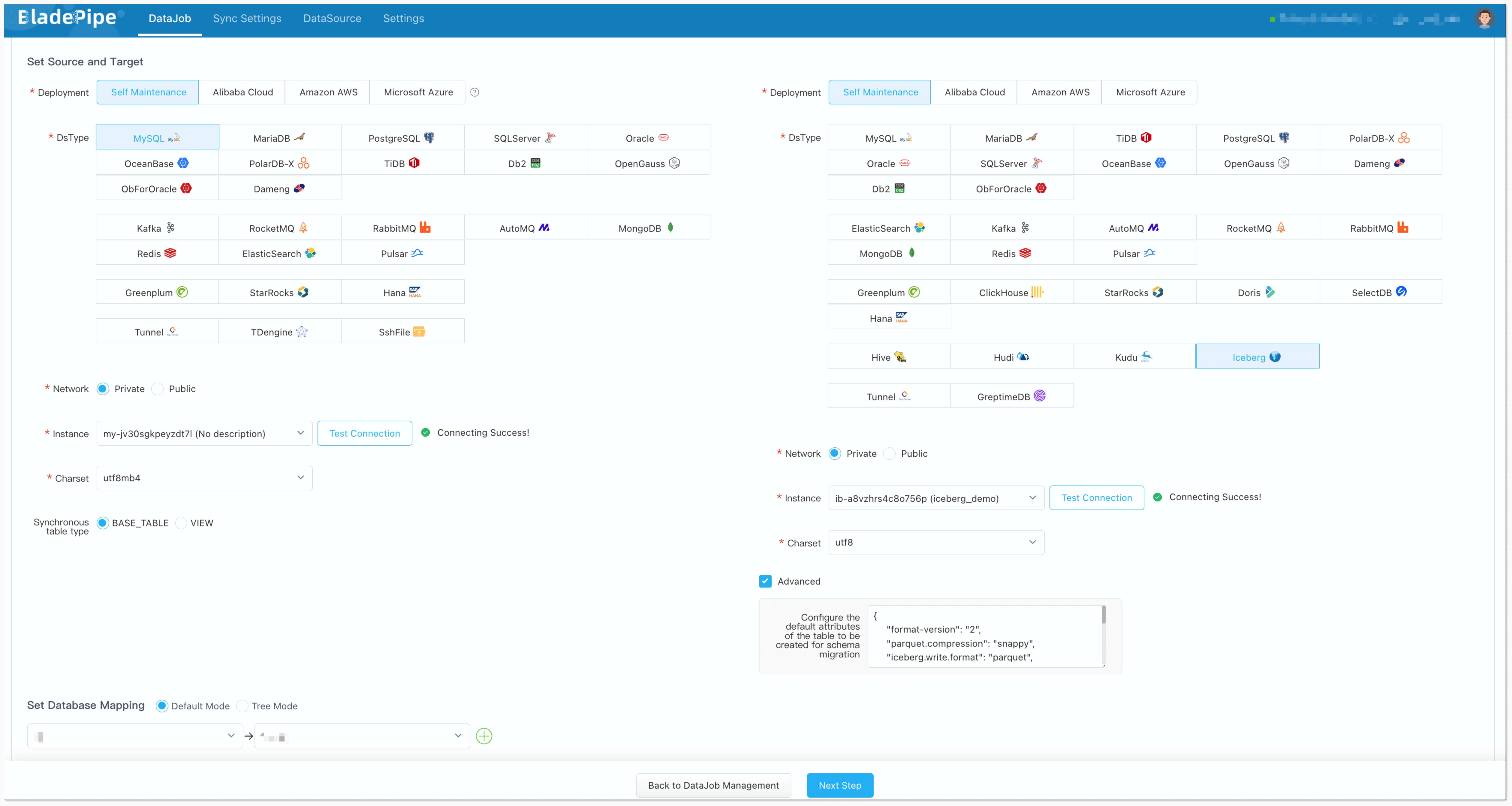 - Select the source and target DataSources, and click Test Connection for both. Here's the recommended Iceberg structure configuration: