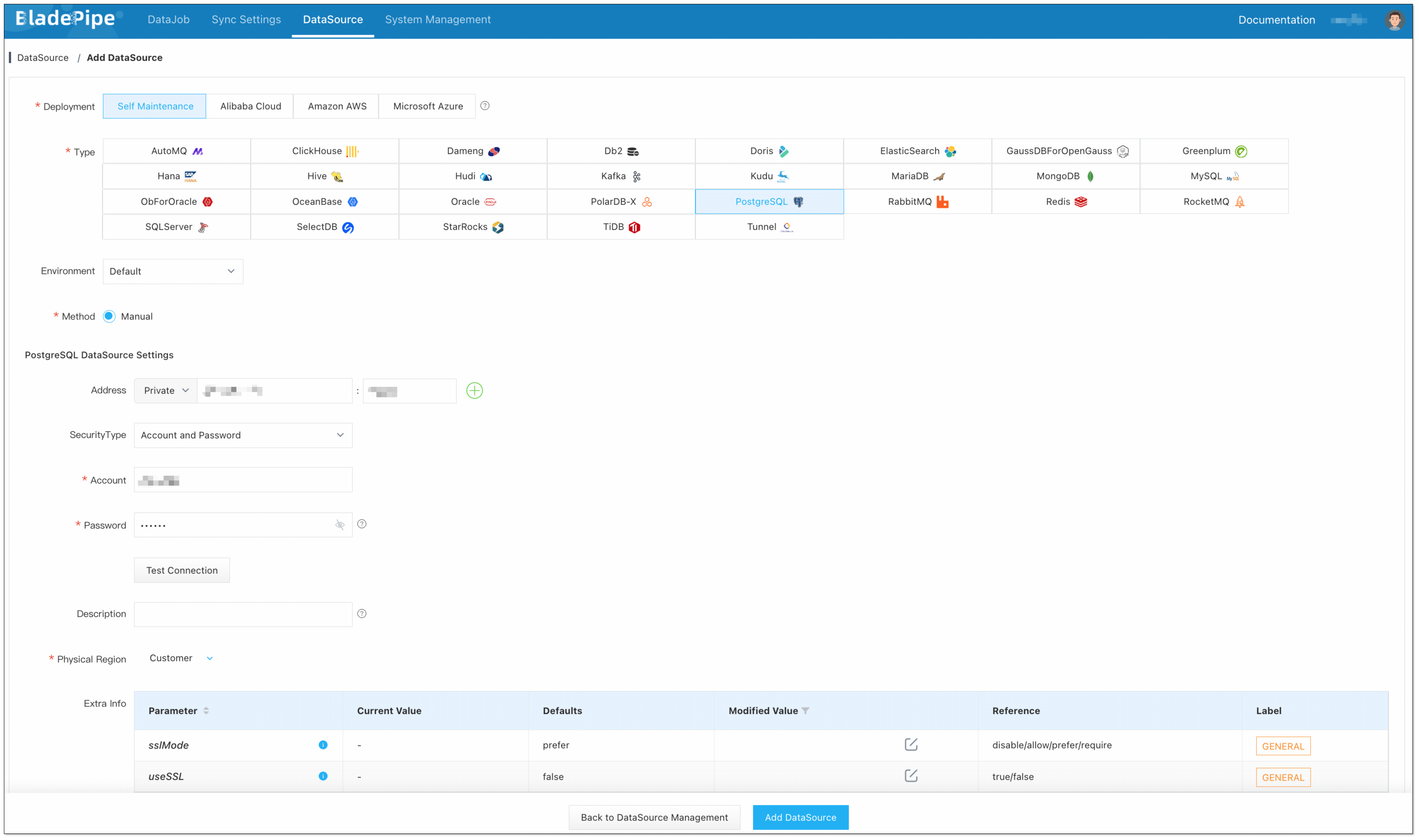 - Select the source and target DataSource type, and fill out the setup form respectively.