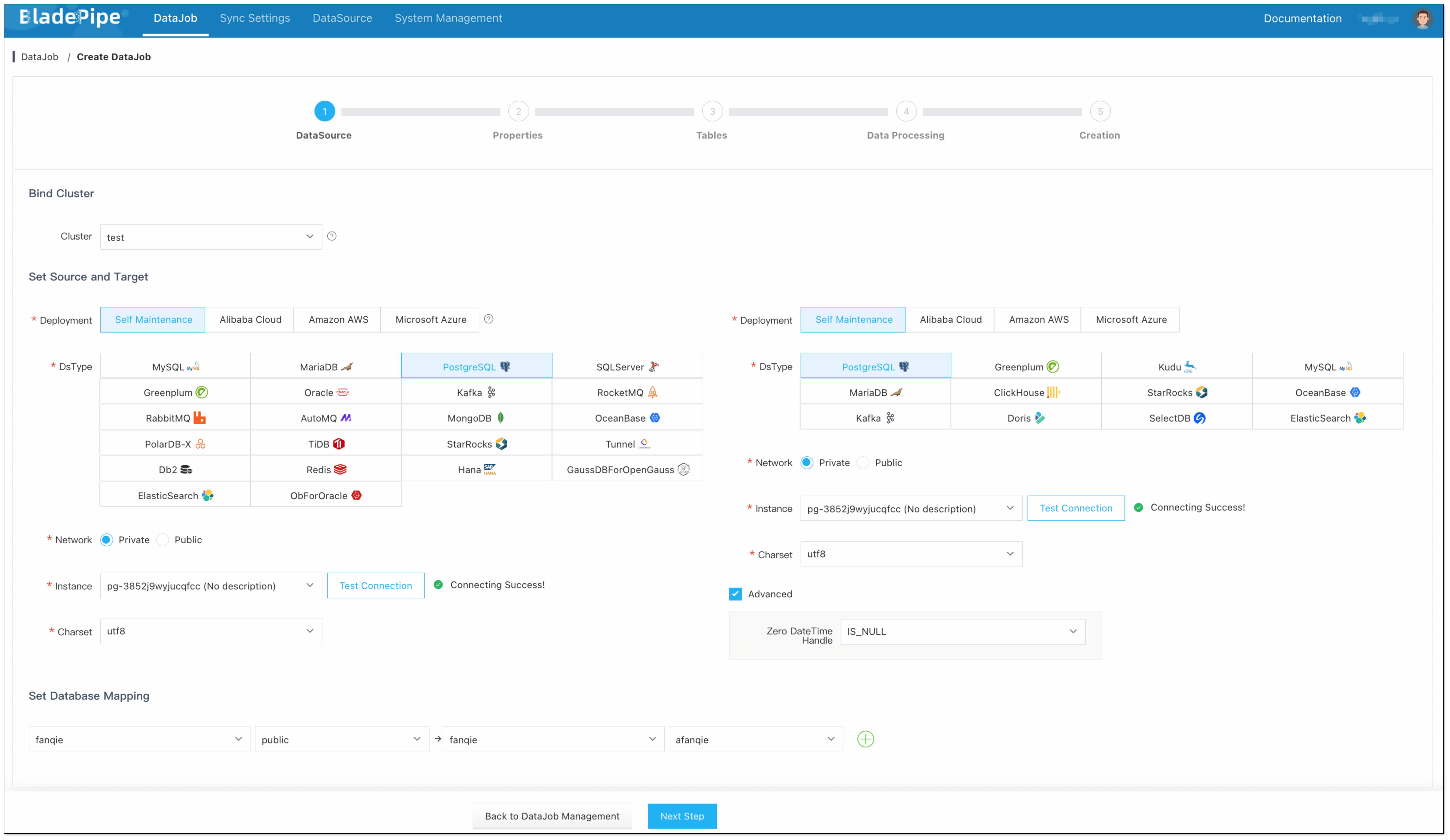 Select the source and target DataSources, and click Test Connection to ensure the connection to the source and target DataSources are both successful.