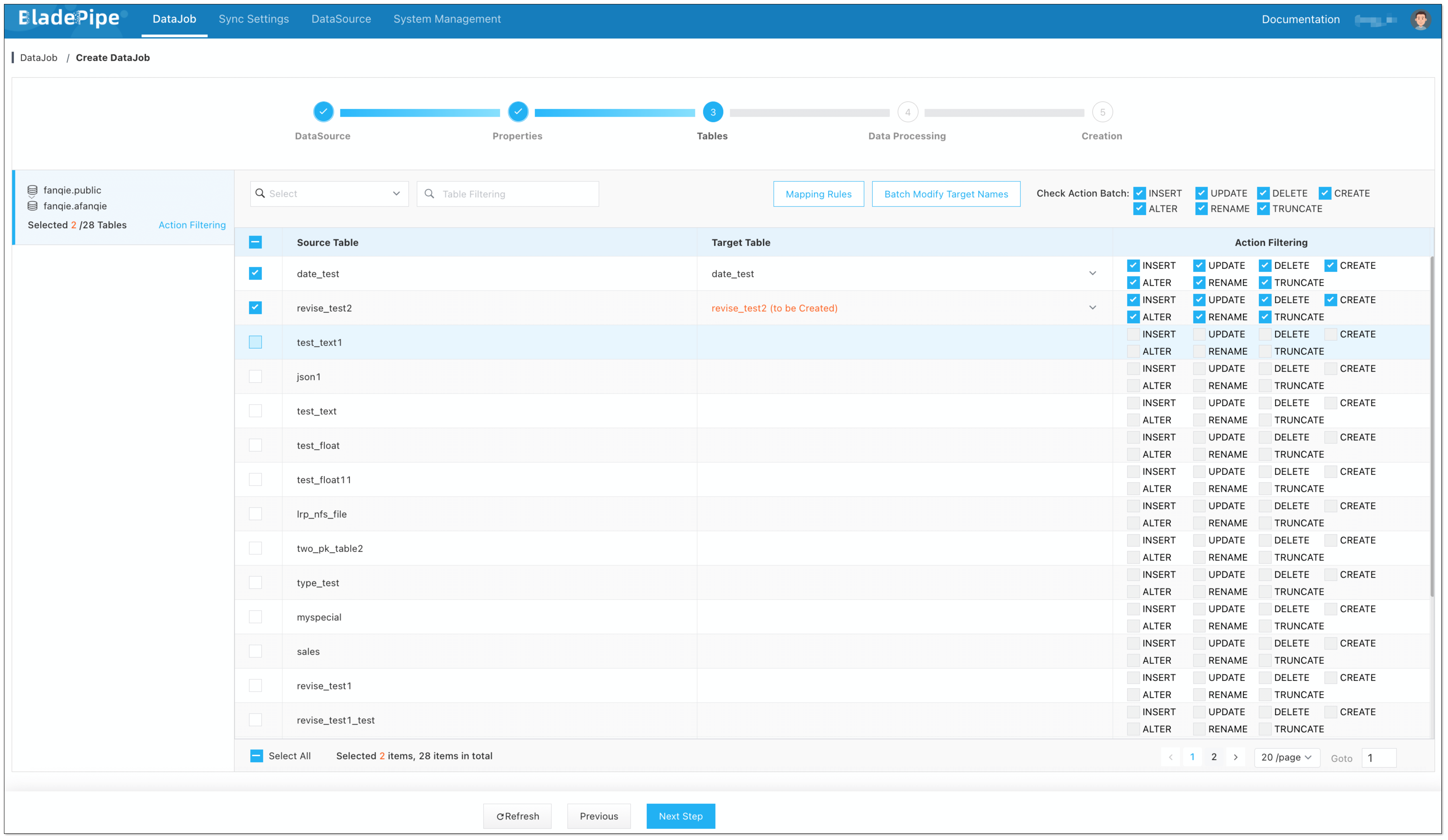 infoIf you need to select specific columns for synchronization, you can create the corresponding tables in the Target in advance.