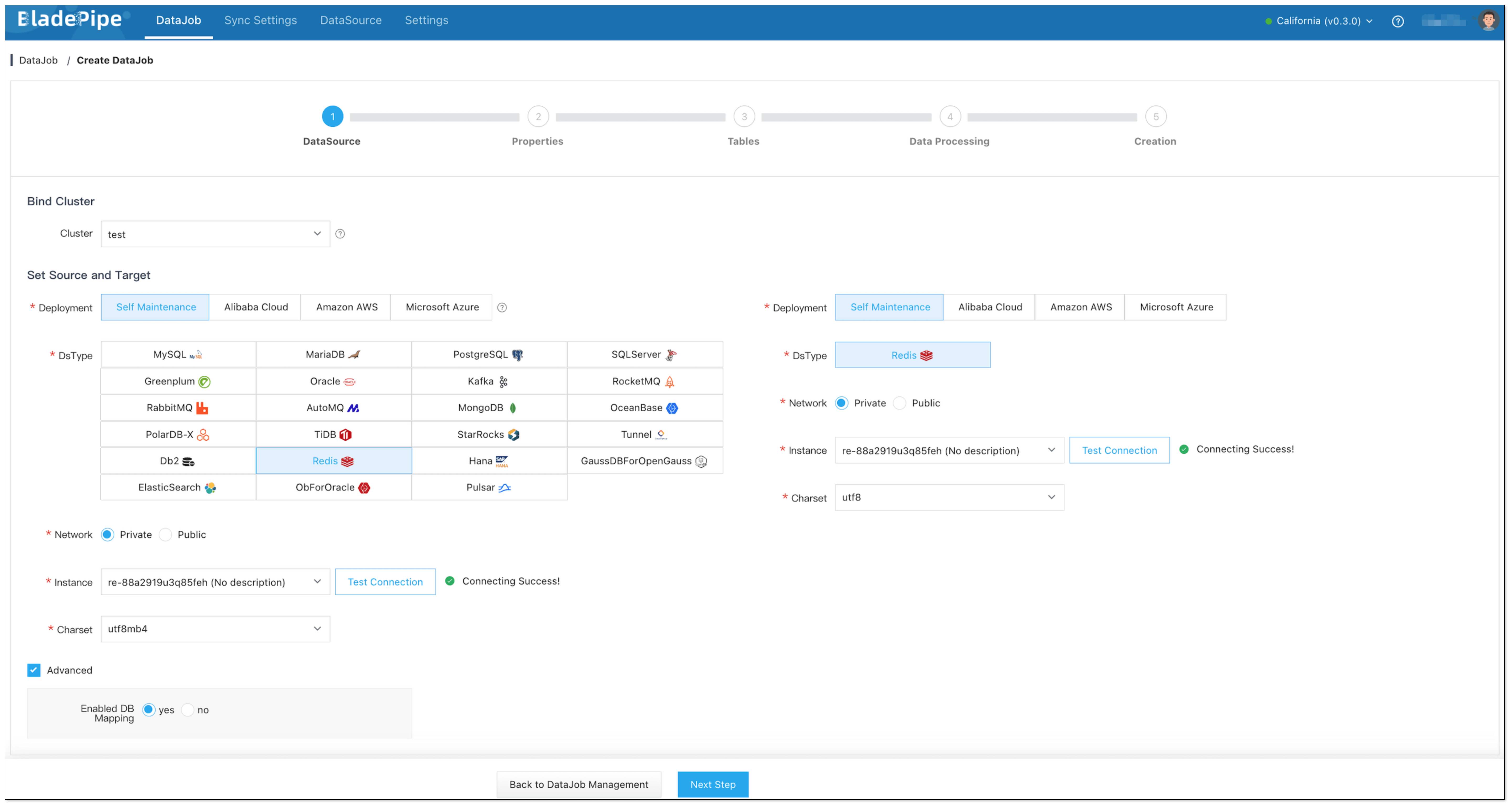 Select the source and target DataSources, and click Test Connection to ensure the connection to the source and target DataSources are both successful.