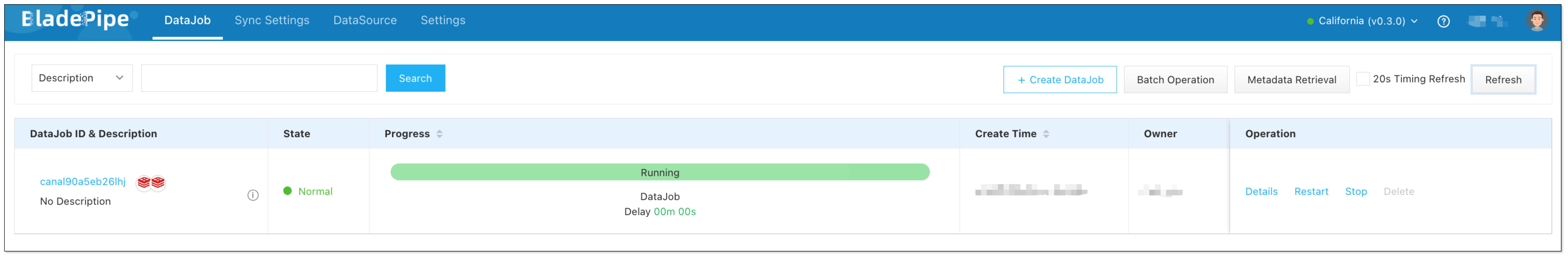 infoThe DataJob creation process involves several steps. Click Sync Settings > ConsoleJob, find the DataJob creation record, and click Details to view it.