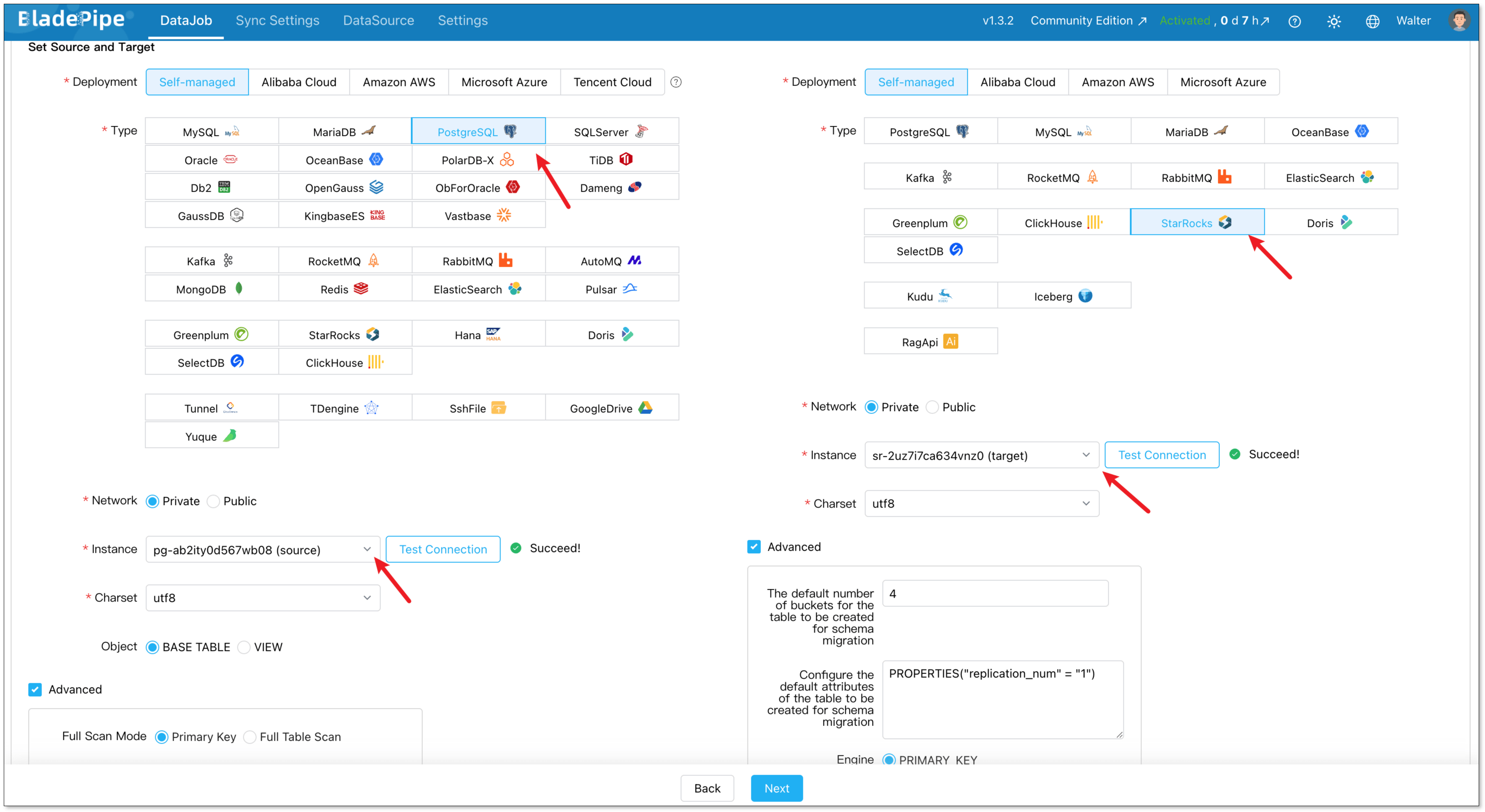 BladePipe, as a modern data integration tool, collapses all of that into a single pipeline. No Kafka, no connector JARs, no Flink job. Just set the source and destination, pick your tables, and it handles CDC capture, schema mapping, retries, and checkpointing out of the box.