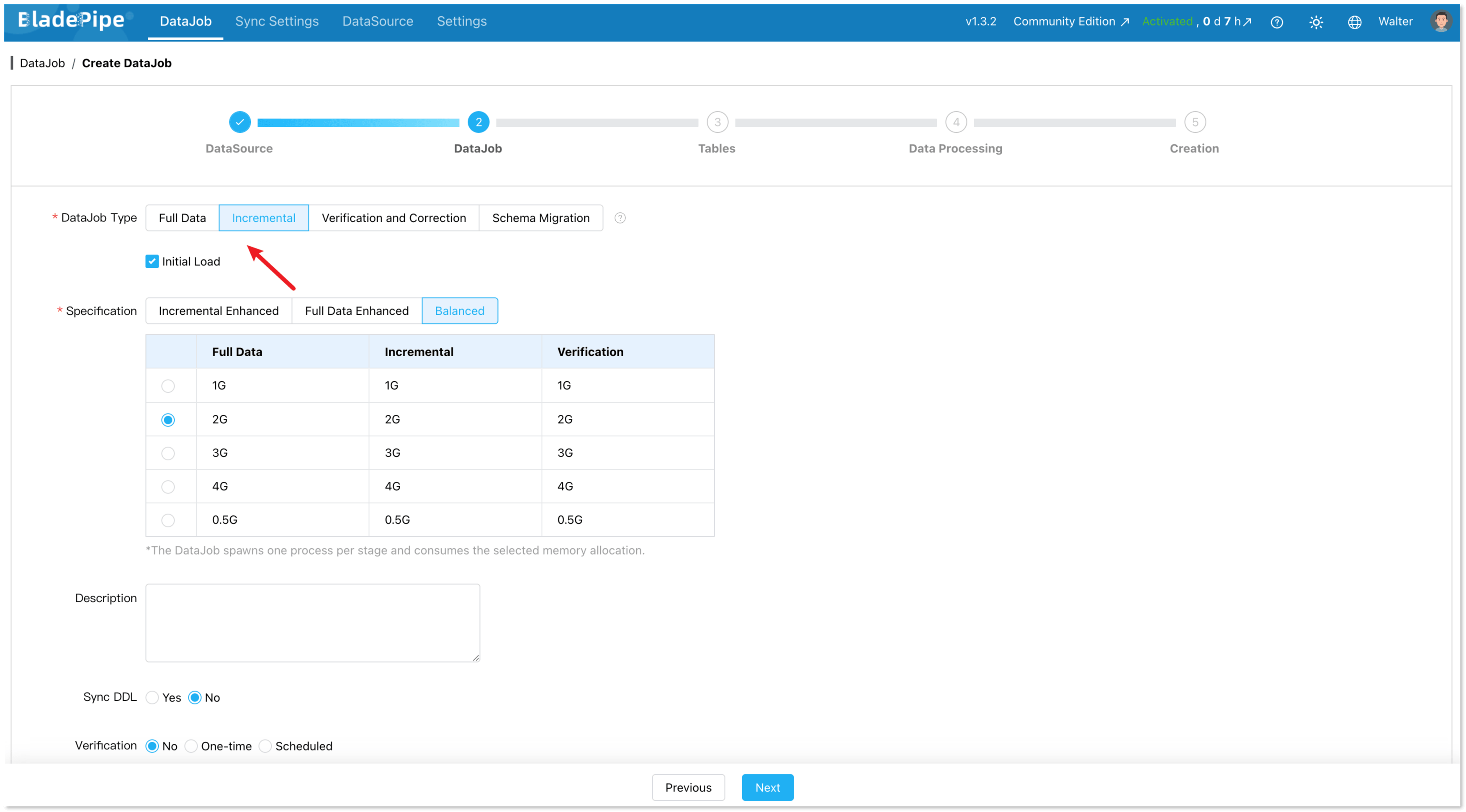 For one-time migration, select Full Data for DataJob Type. For continuous replication, select Incremental, together with the Initial Load option.