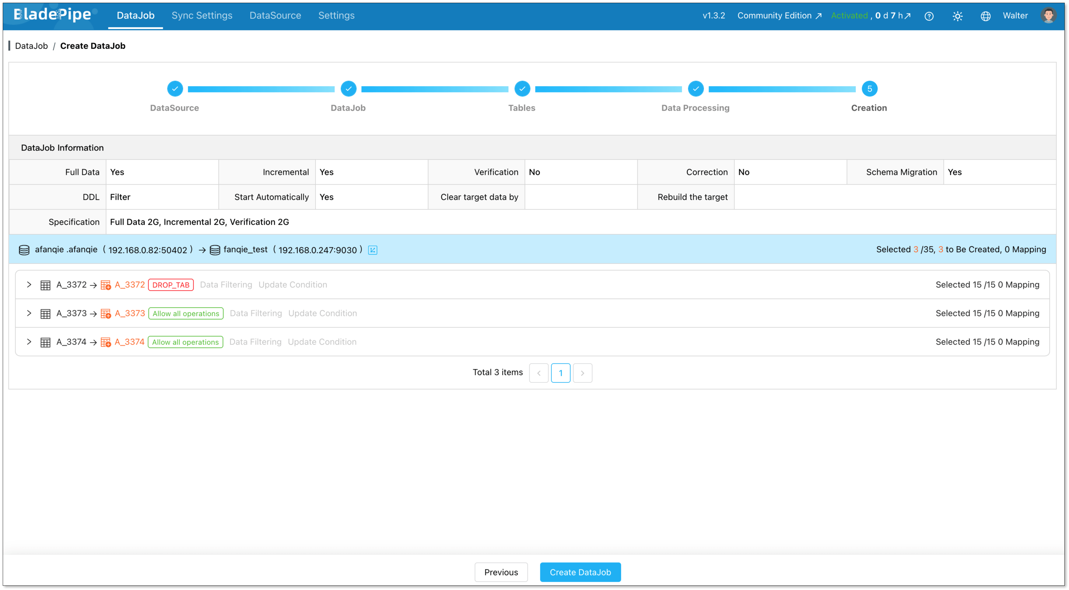 Go to DataJob > Create DataJob. Then select the source and target DataSources, and click Test Connection for both.