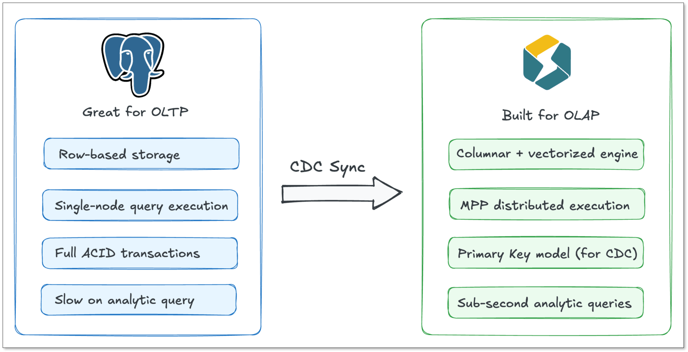 - PostgreSQL is great for transactions, not analytics, while StarRocks delivers fast, real-time analytical queries at scale.