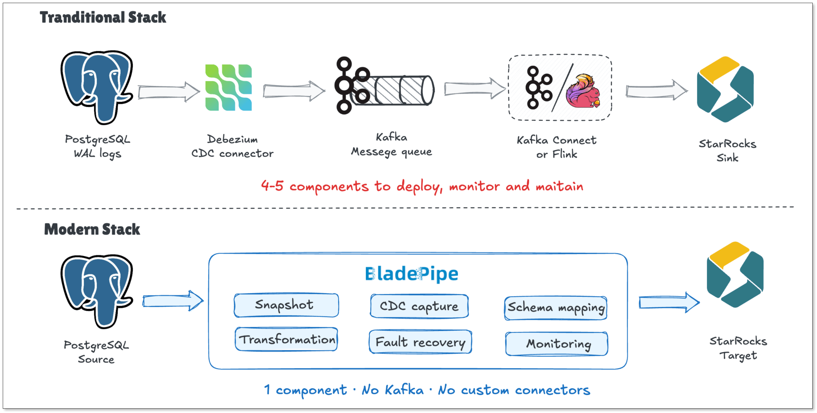 - Modern tools like BladePipe simplify everything into one pipeline, with no extra infrastructure.