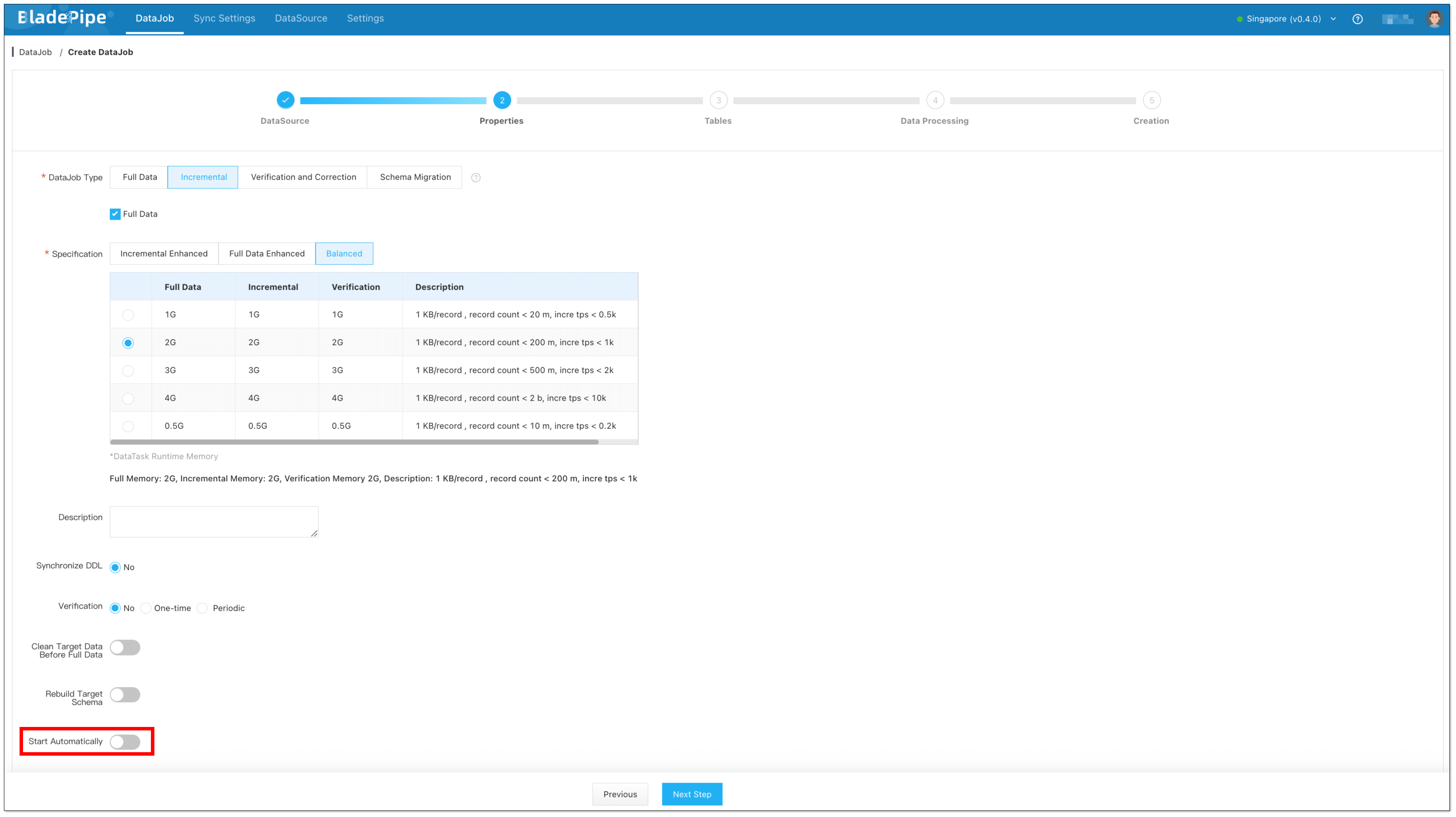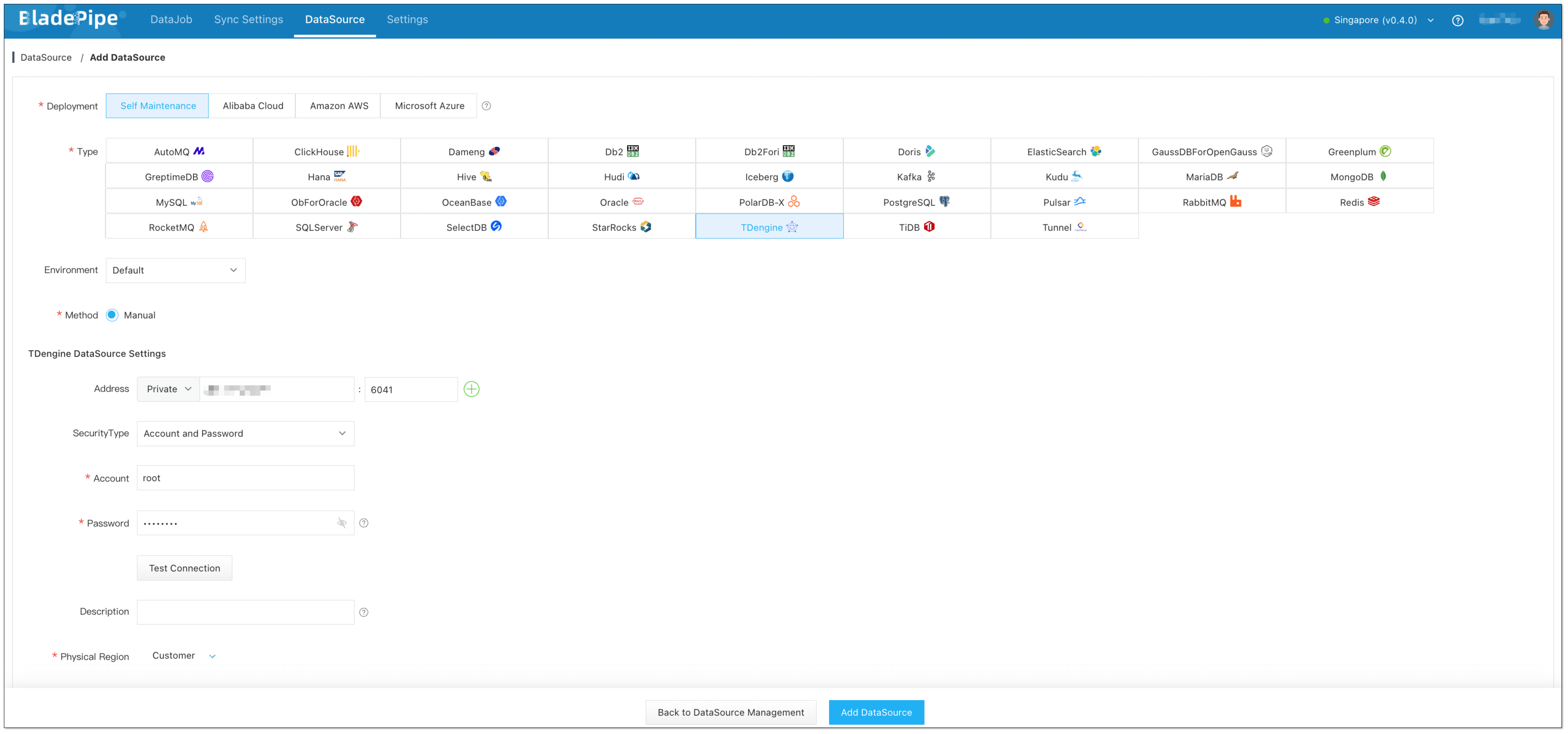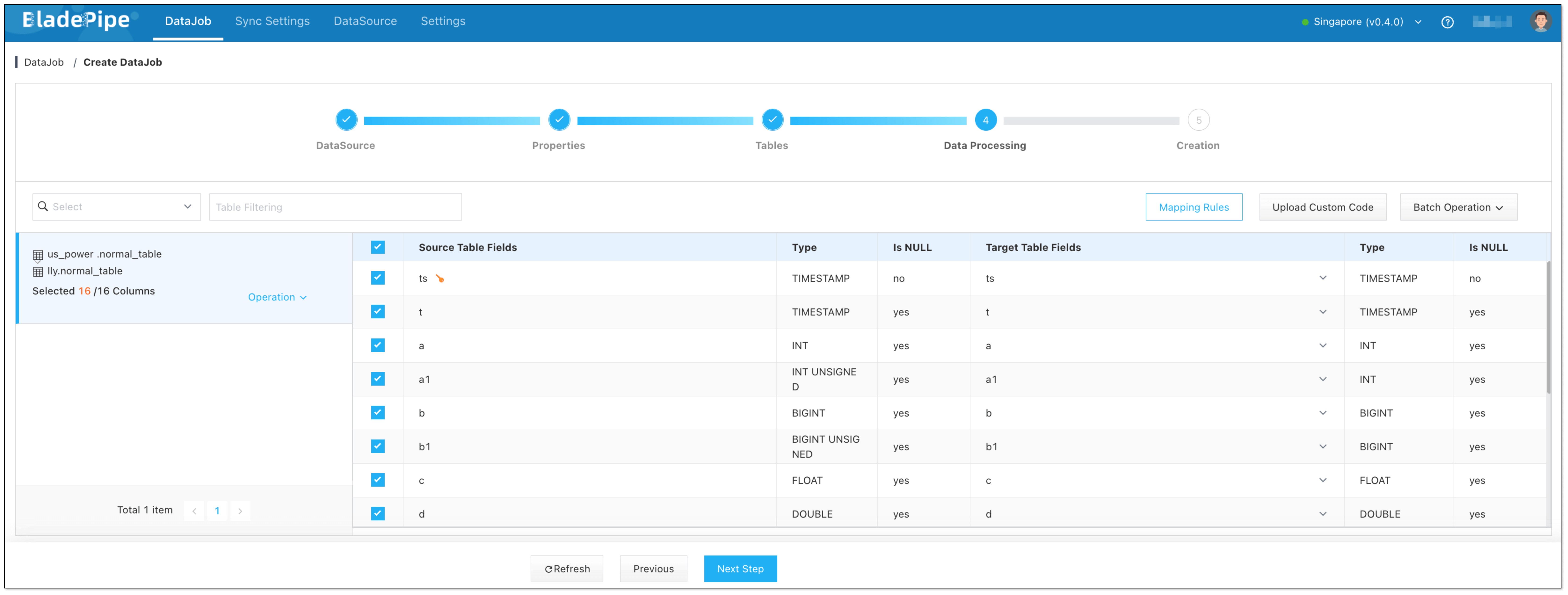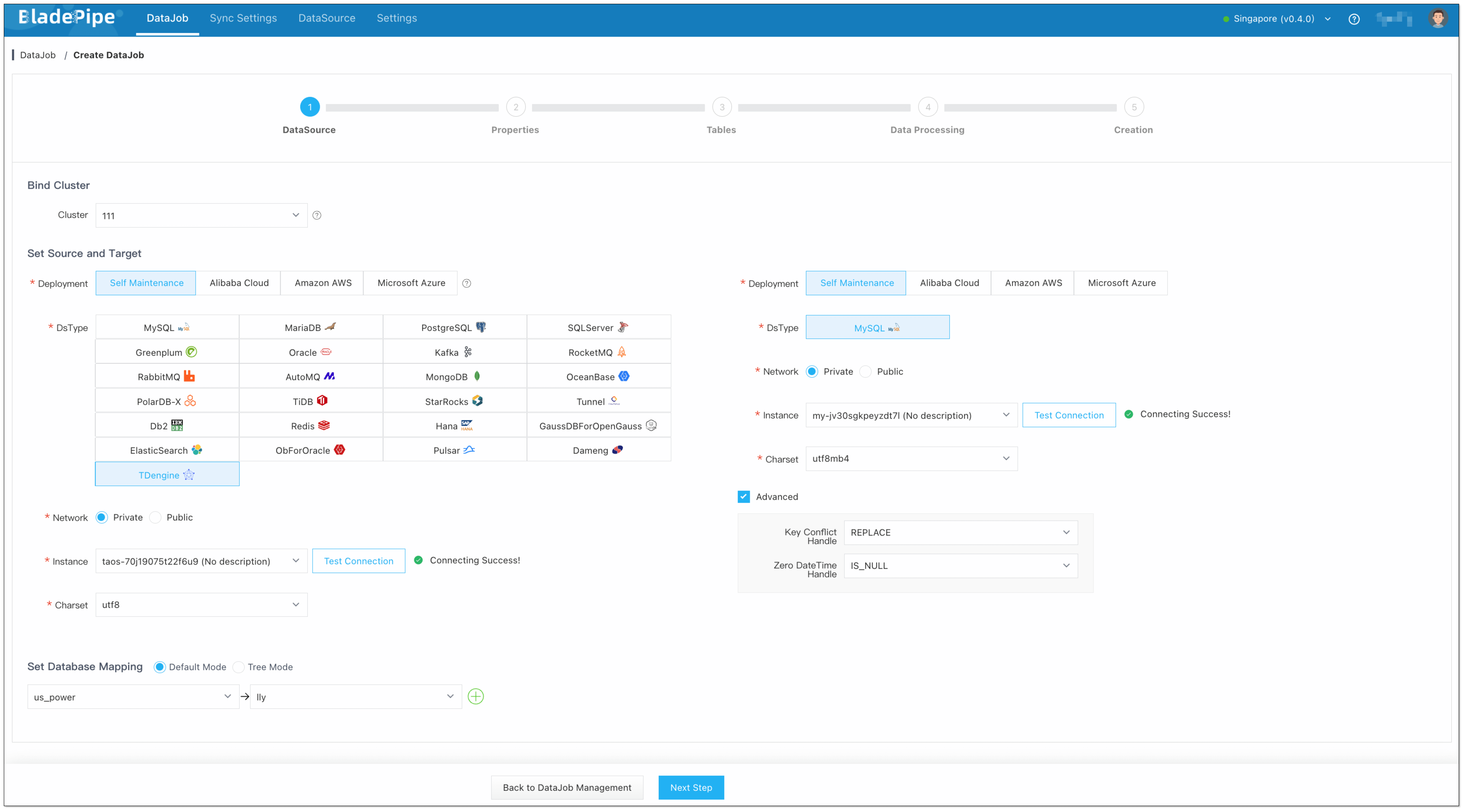 - Select the source and target DataSource type, and fill out the setup form respectively.