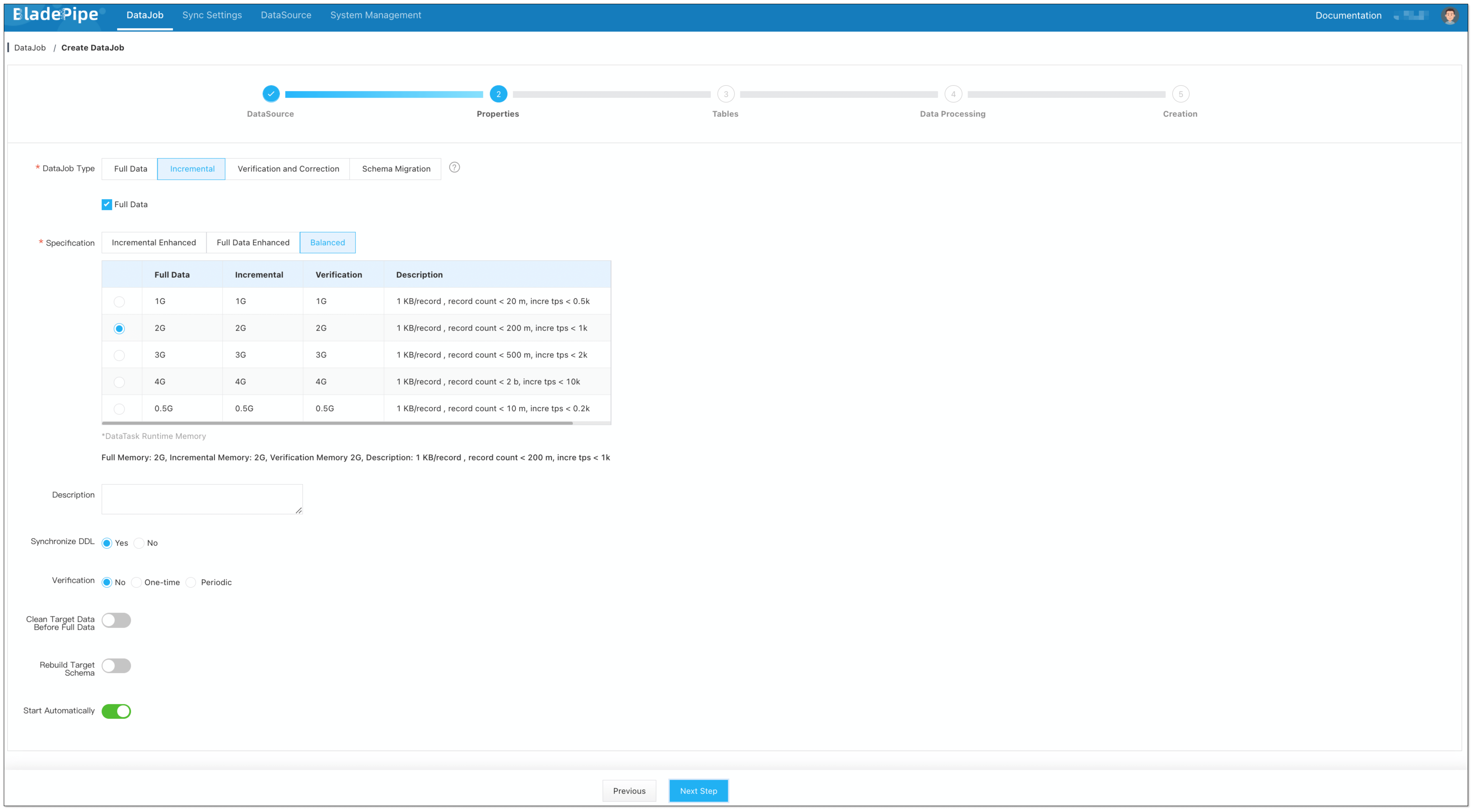 Select Incremental for DataJob Type, together with the Full Data option.