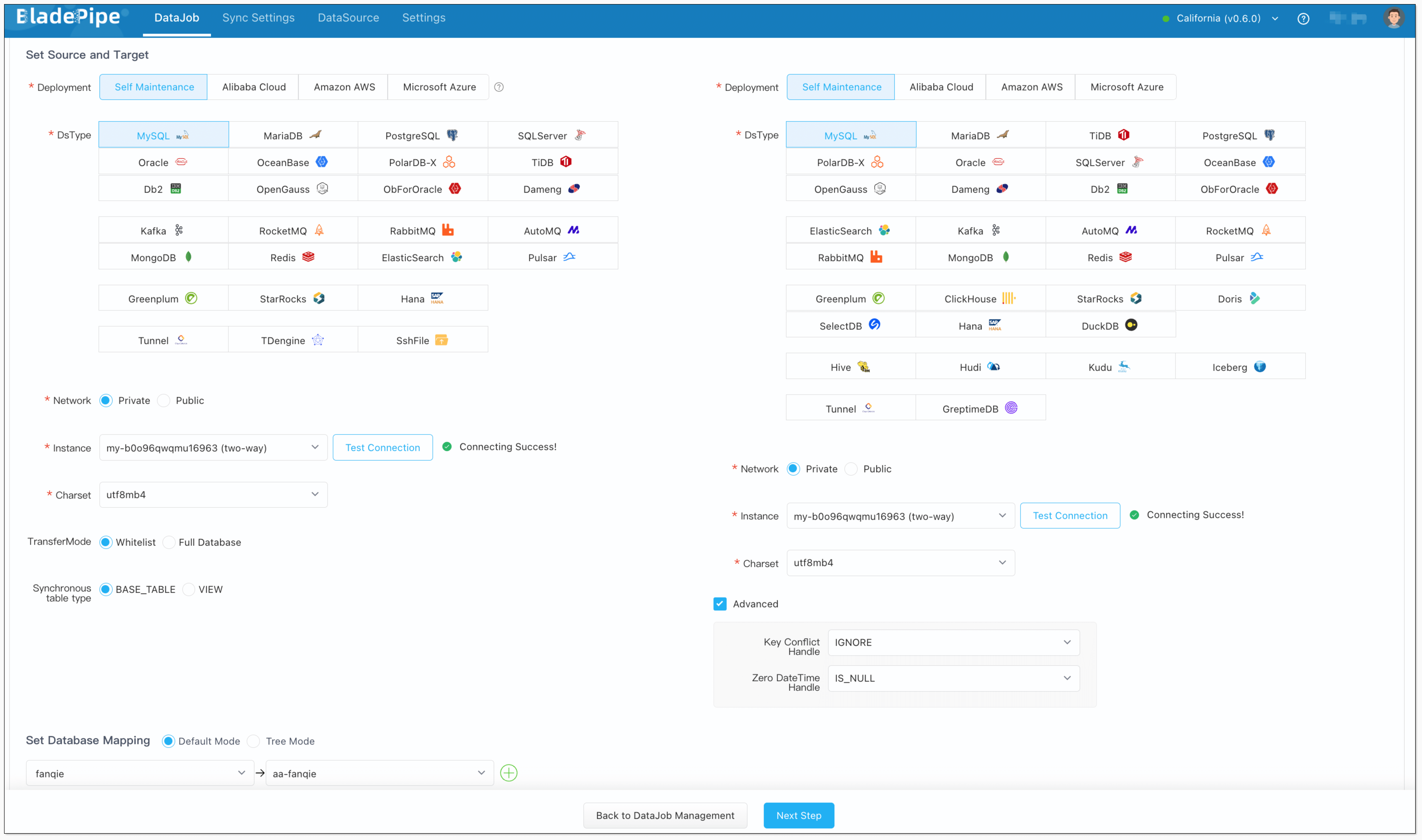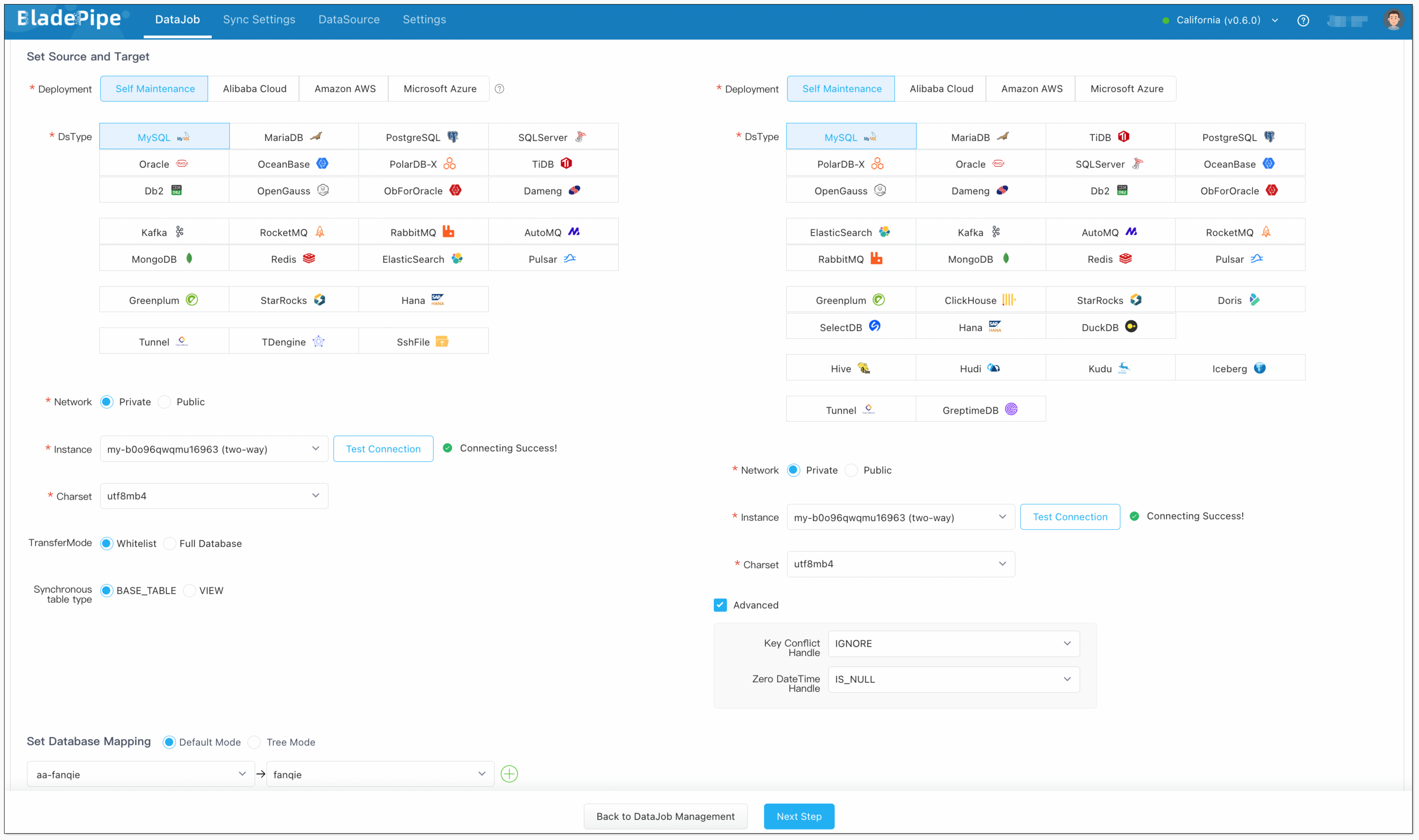 - Select the source and target DataSources, and click Test Connection to ensure the connection to the source and target DataSources are both successful.