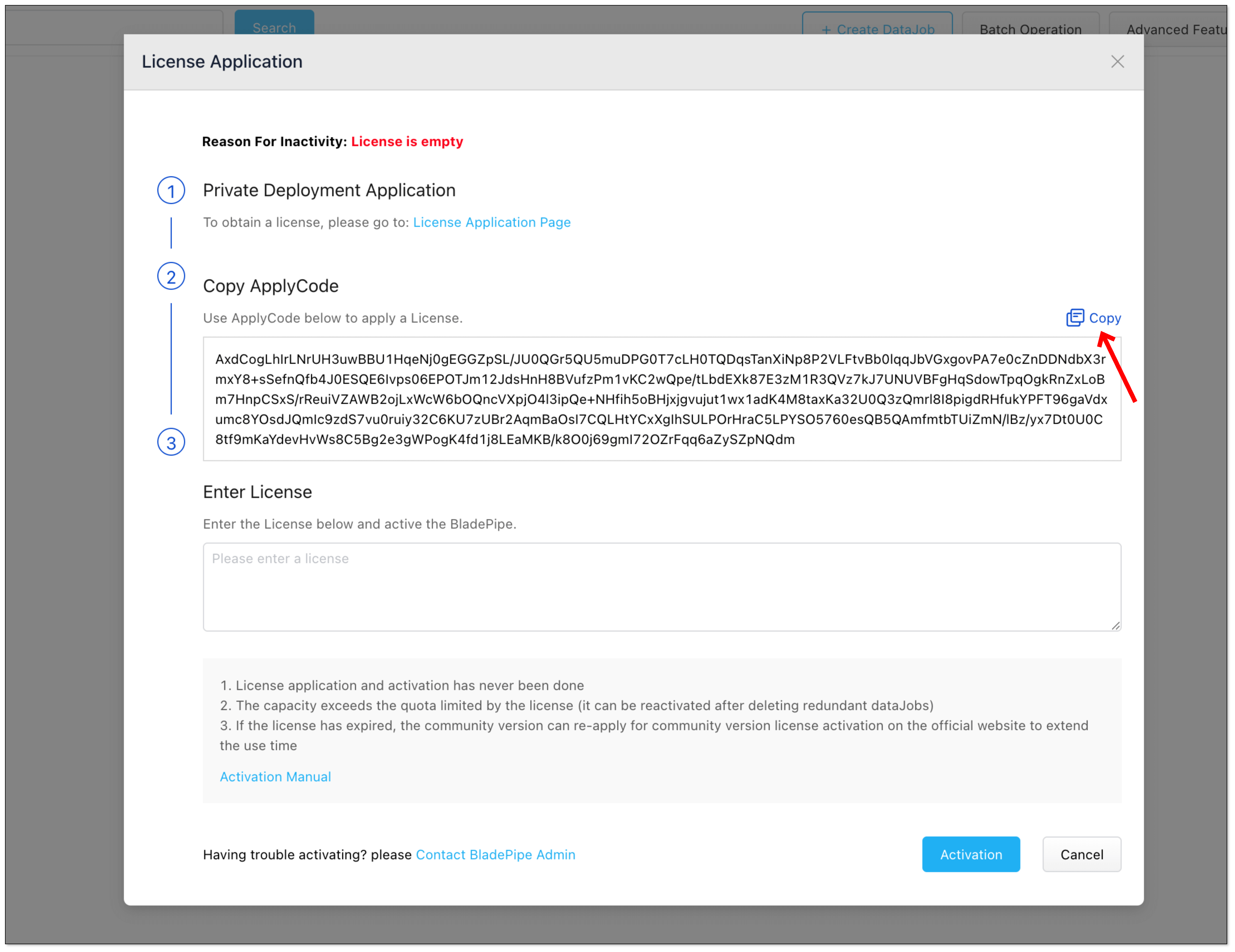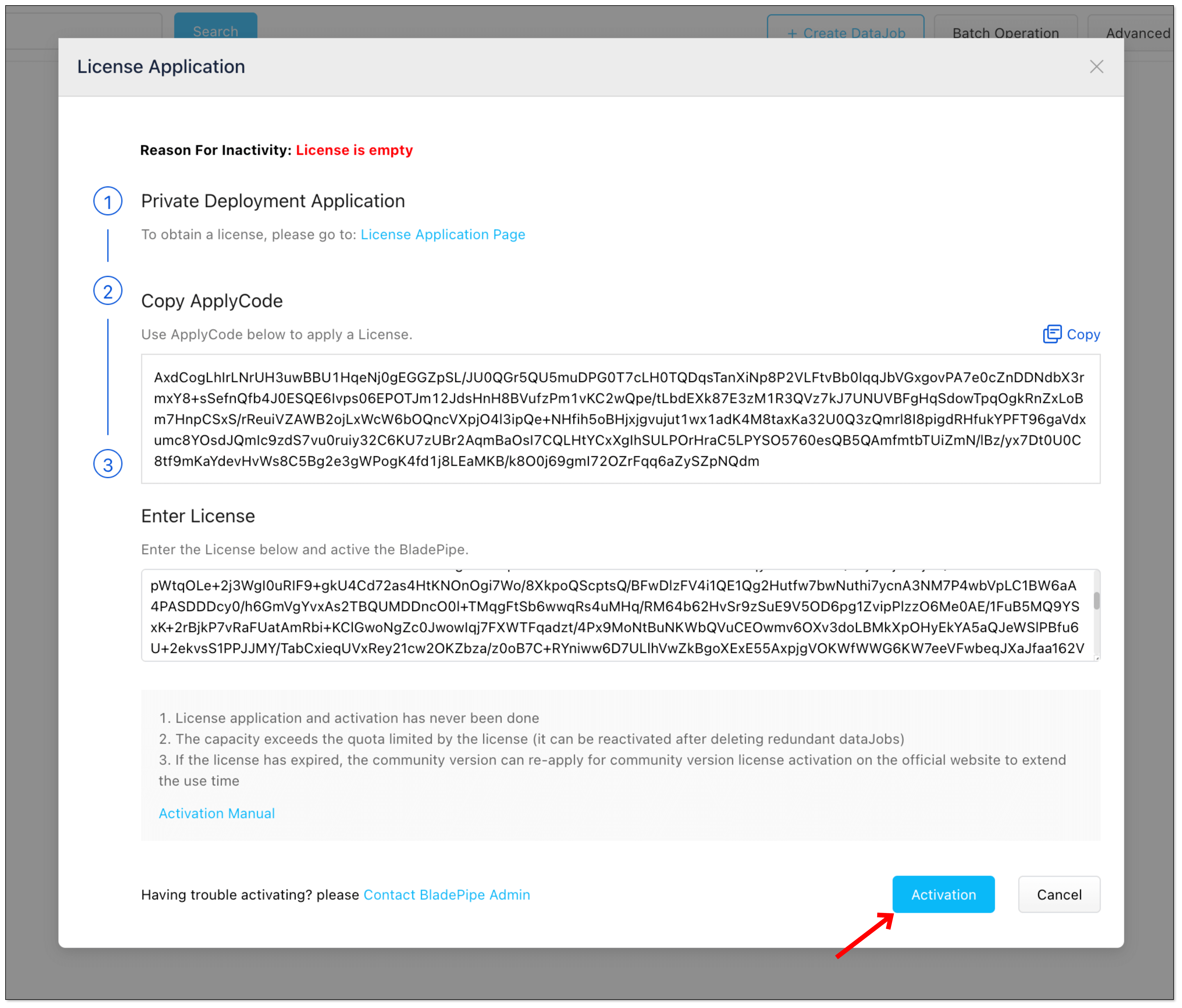 - License: A license is used to activate BladePipe On-Premise, including the authorization duration and number of authorized links.