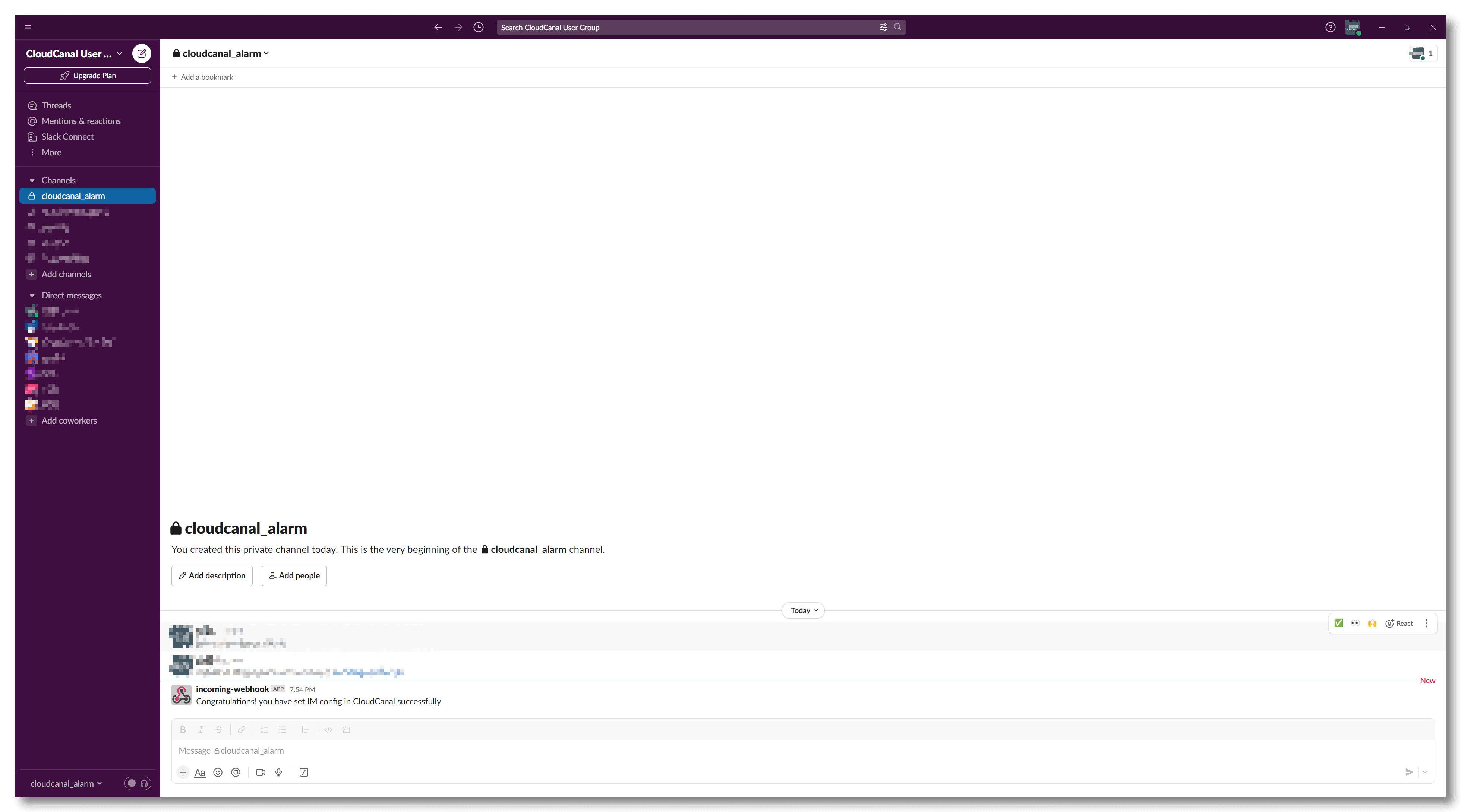 After the Slack alert group is successfully created, and the Slack webhook is filled in the BladePipe User Avatar>Account>User Setting, subsequent BladePipe DataJob alerts will be sent to this group.