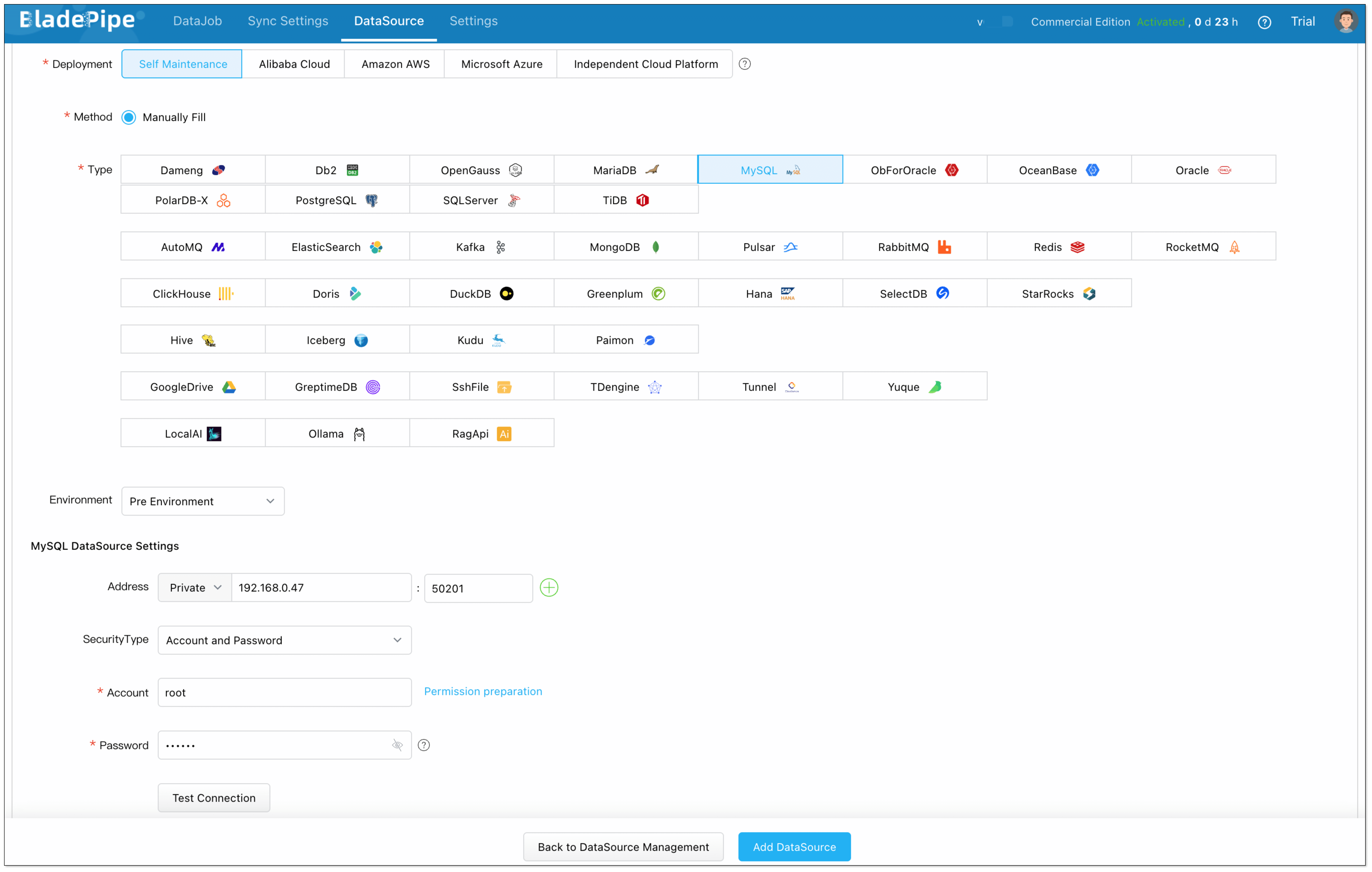 Here we use a self-managed MySQL DataSource as an example. For more details, see Add Self-managed DataSource. For the other supported DataSources, see Supported DataSources.